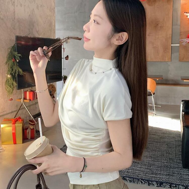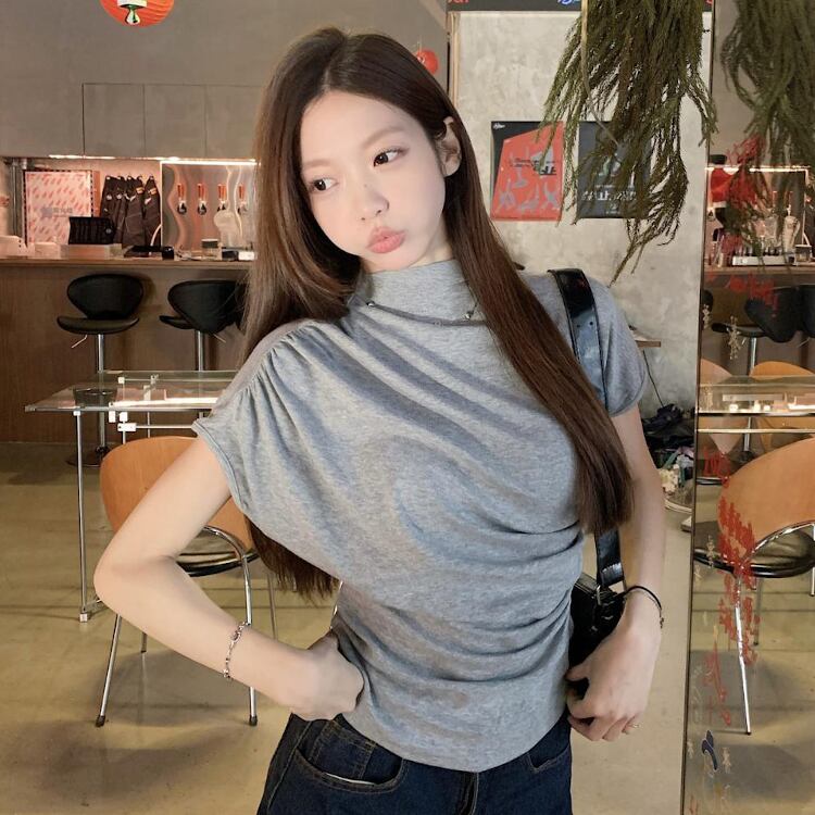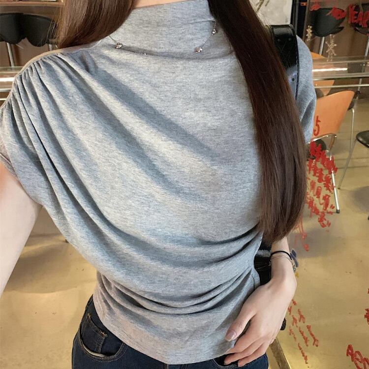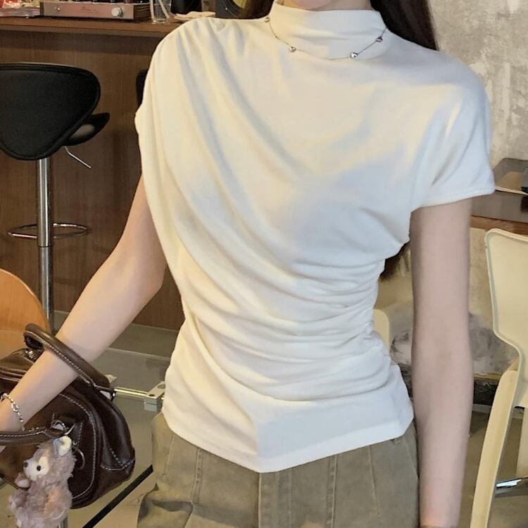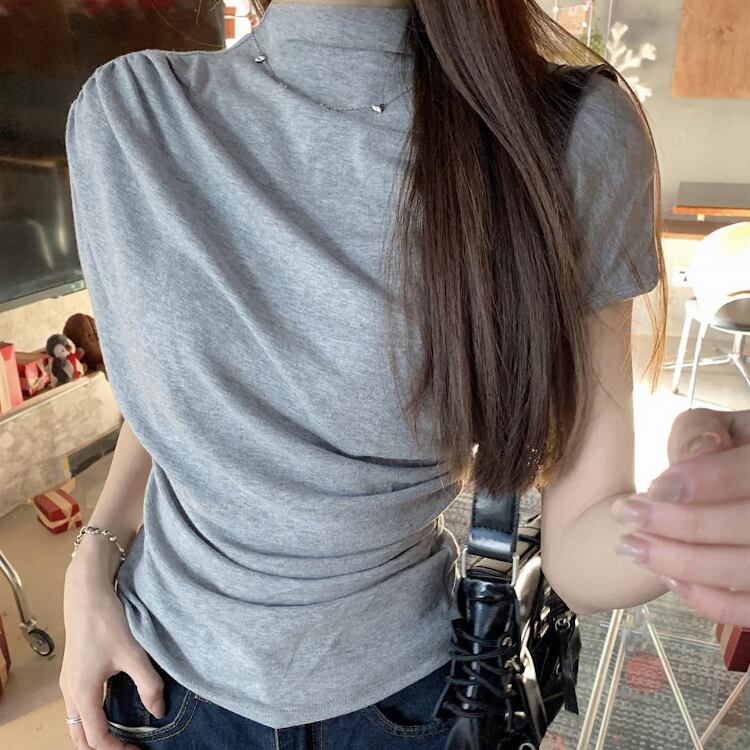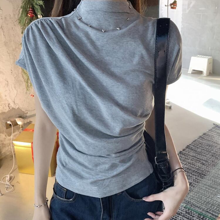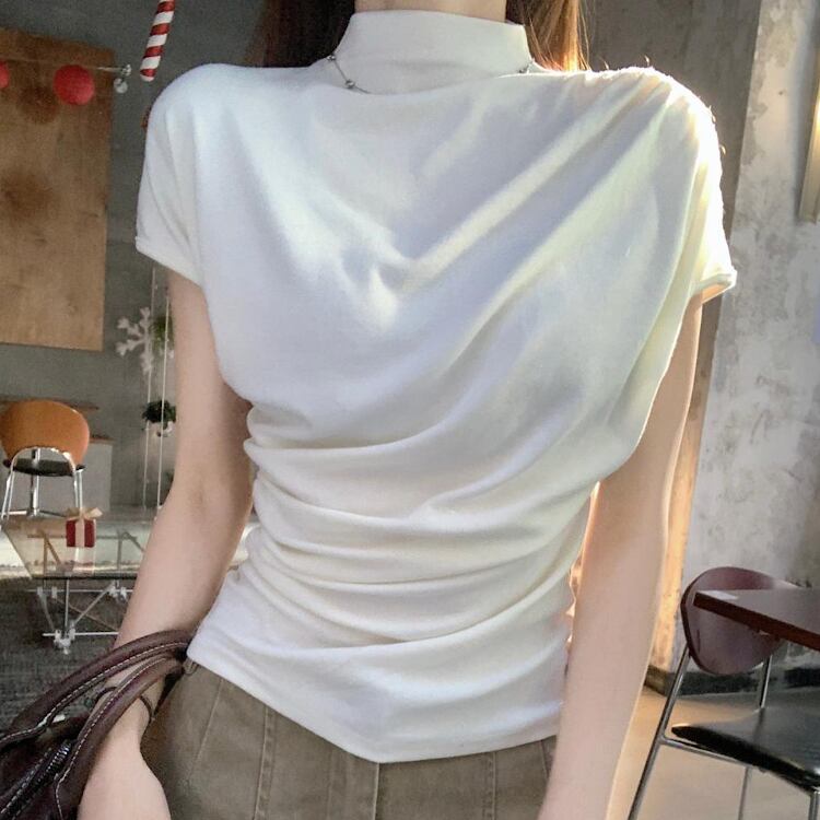 レディース トップス カットソー フレンチスリーブ モックネック スリム 細身 アシンメトリー ドレープ フェミニン ギャザー かわいい 大人可愛い カジュアル 上品 おしゃれ かっこいい こなれ感 個性的 クール エレガント 都会的 軽やか 無地 夏 ママ OL 学生 デート お出かけ 旅行 ショッピング コンサート ライブ 合コン コンパ カフェ ランチ コーデ 普段使い 着回し モテ インスタ映え スタイルアップ S M L XL 黒 ブラック グレー ベージュ ベーシックカラー 大人カラー