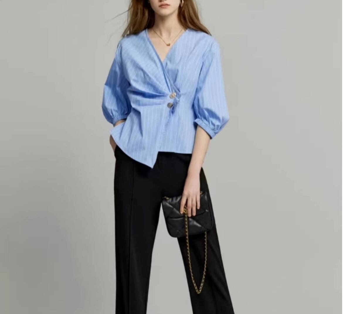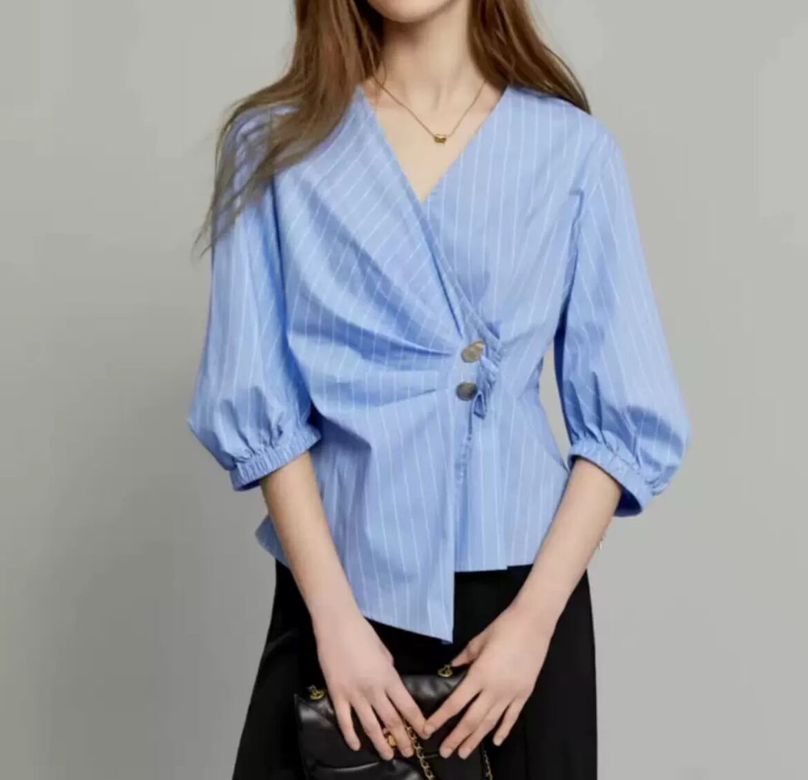 トップス シャツ ブラウス レディース 7分袖 パフスリーブ Vネック カシュクール アシンメトリー ドレープ フェミニン ギャザー ふんわり タック ダブルボタン 大人可愛い シンプル カジュアル 上品 おしゃれ こなれ感 ラフ ルーズ モード系 エレガント 抜け感 ナチュラル リラックス 軽やか 快適 爽やか ストライプ 春 夏 オフィス OL 通勤 デート お出かけ イベント 女子会 休日 ショッピング カフェ ランチ 韓国 オルチャン コーデ 楽ちん 体型カバー 清楚 S M L ライトブルー