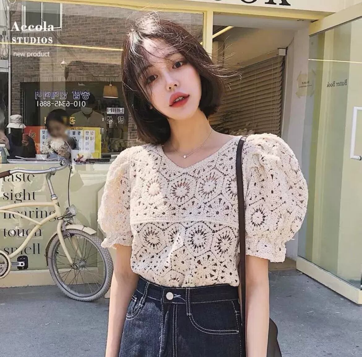 クロップド丈の半袖パフスリーブが、フェミニンさを引き立ててくれ、どんなコーディネートにも合わせやすい一枚です。