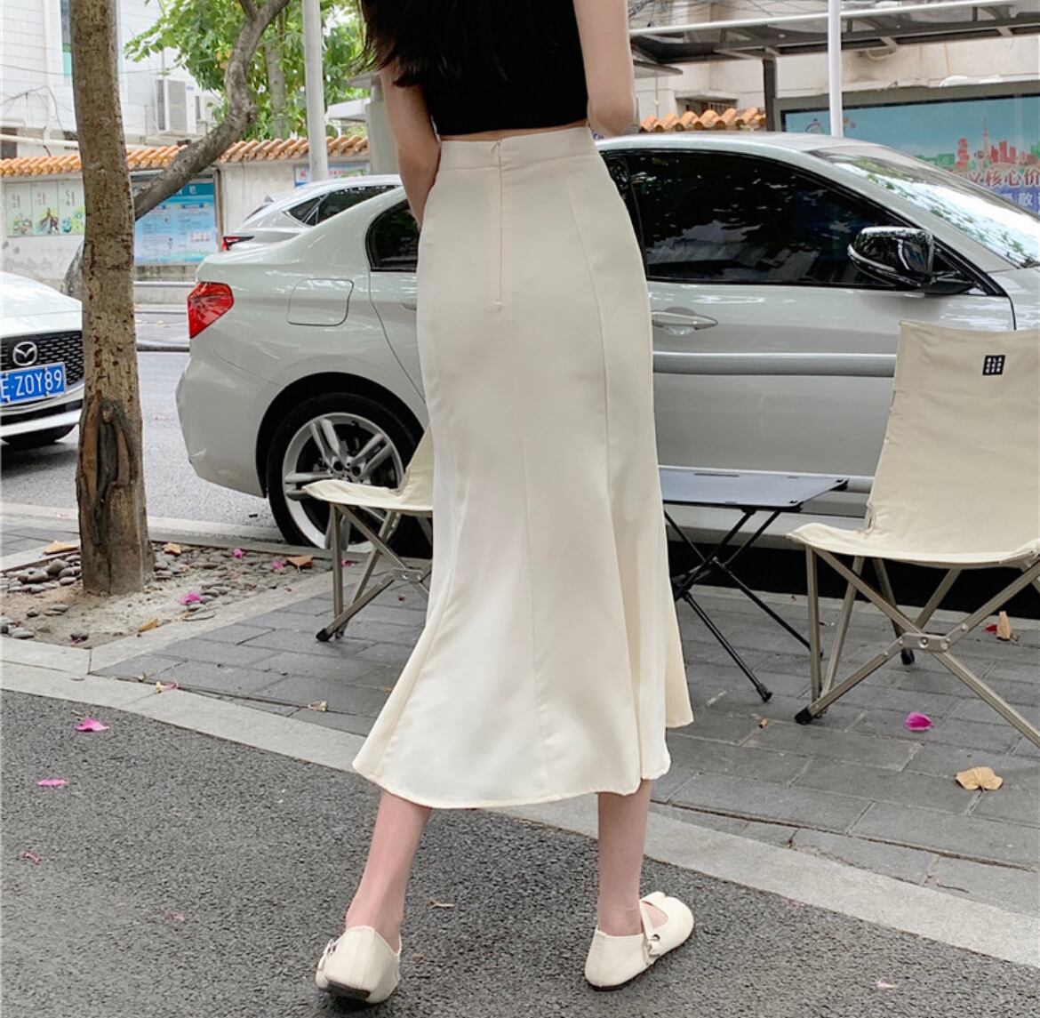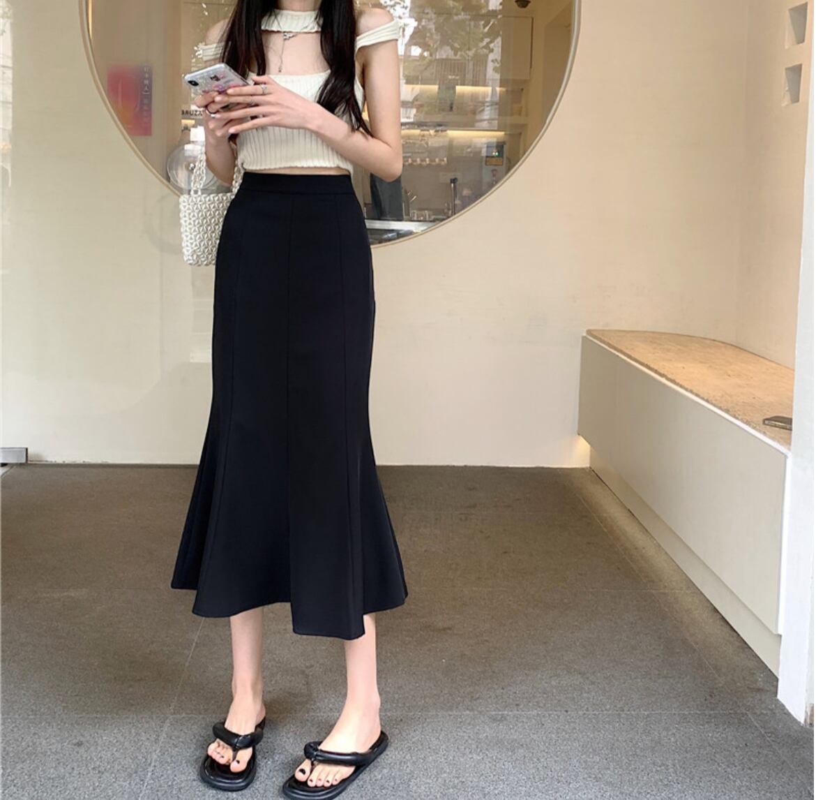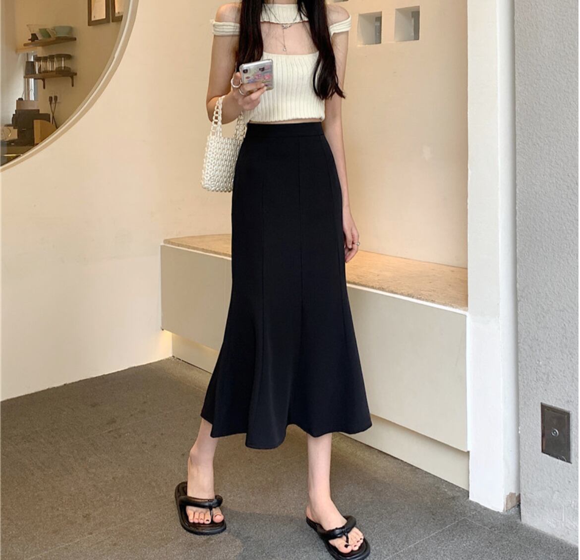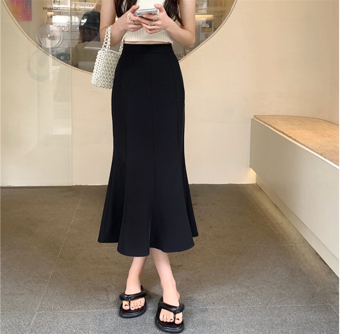 スカート ボトムス レディース フィッシュテール ラッフルスカート ミモレ ロング 細身 マーメイド ドレープ フェミニン スリムライン ハイウエスト 大人可愛い きれいめ シンプル カジュアル 上品 おしゃれ こなれ感 ラフ ガーリー モード系 エレガント 抜け感 ナチュラル 清潔感 優美 シーズンレス オフィス OL 通勤 デート イベント 女子会 休日 ショッピング カフェ ランチ 韓国 オルチャン コーデ 脚長 普段使い 着回し モテ トレンド スタイルアップ XS S M L ホワイト ブラック