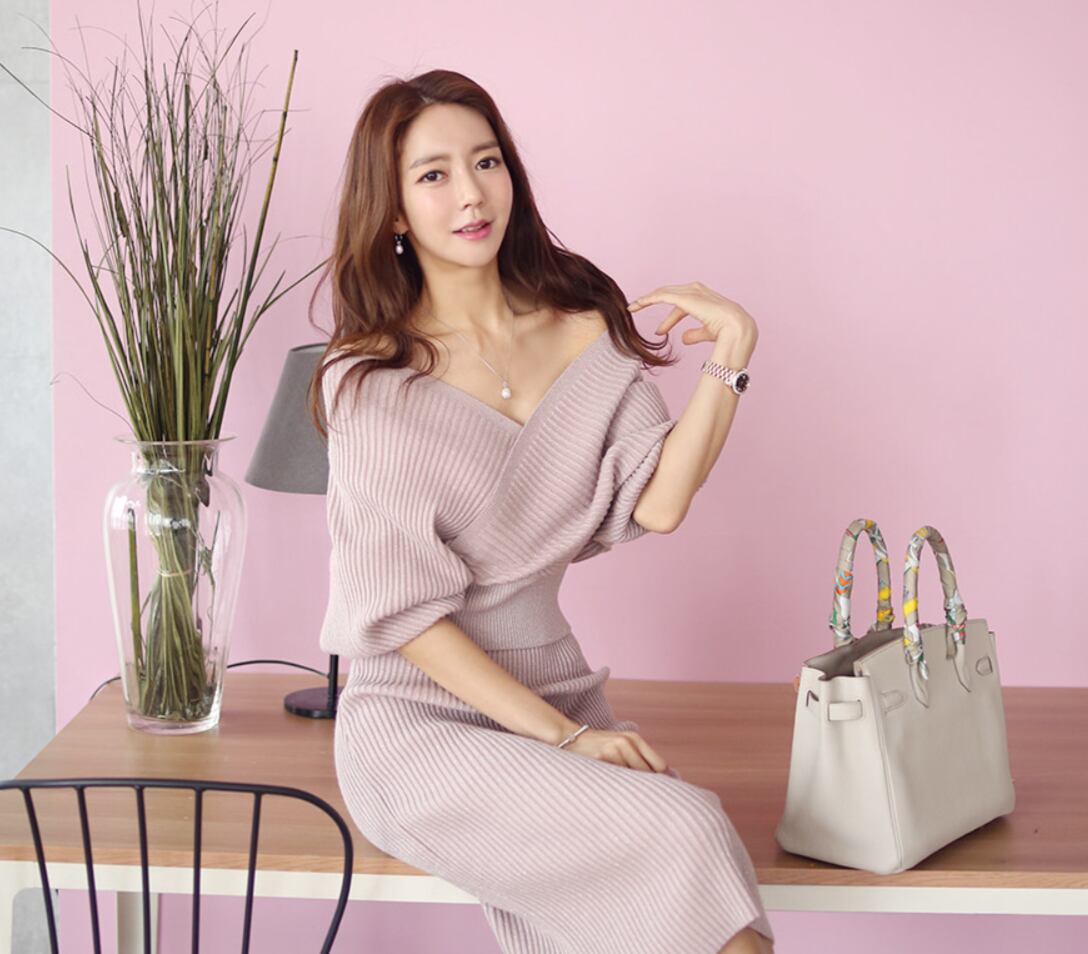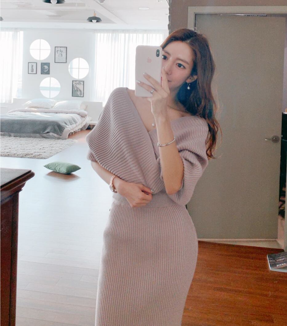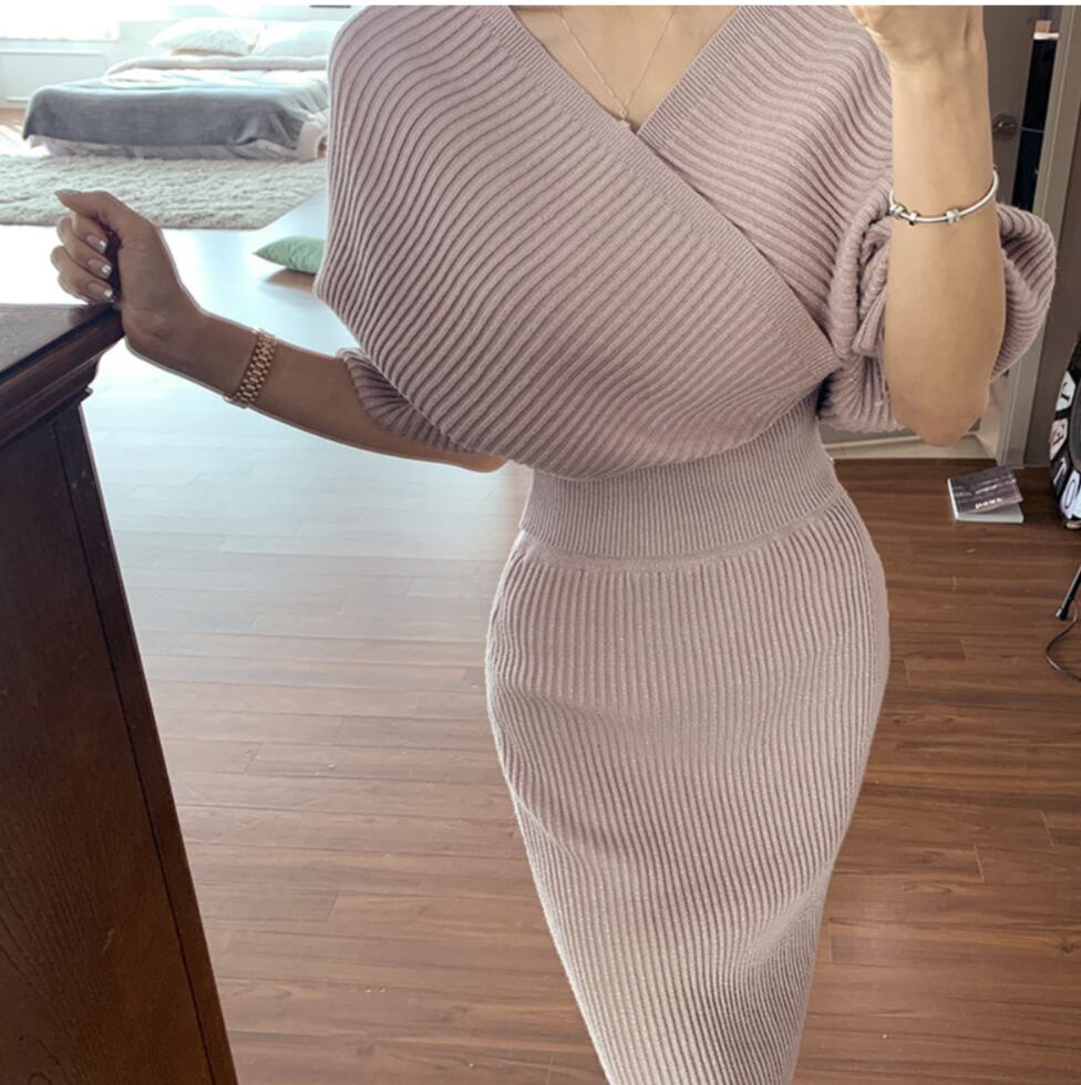 レディース ワンピース レディース 膝丈 ミモレ 長袖 ボリューム袖 ドルマンスリーブ Vネック タイト スリム 細身 切り替え ウエストマーク 切り替えデザイン ニット ストレッチ 伸縮性 きれいめ シンプル 上品 おしゃれ かっこいい こなれ感 モード系 主役級 存在感 フォーマル セクシー 無地 秋 冬 デート お出かけ 旅行 高原 ホテル ガーデン ショッピング 発表会 お花見 合コン コンパ 婚活 お呼ばれ 韓国 オルチャン コーデ スタイルアップ フリーサイズ ワンサイズ ベージュ ピンク
