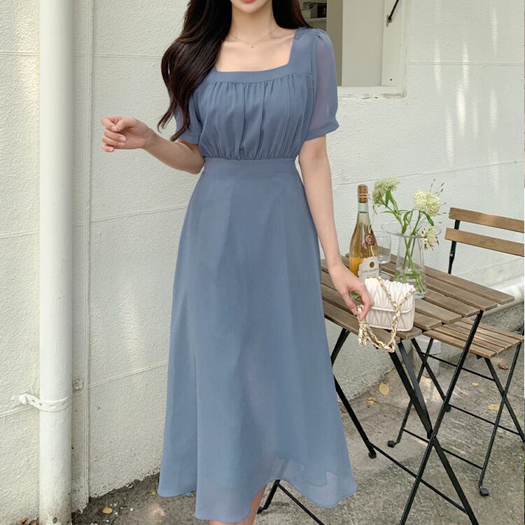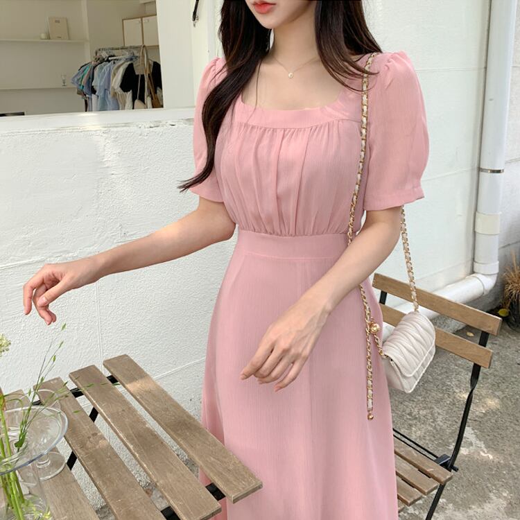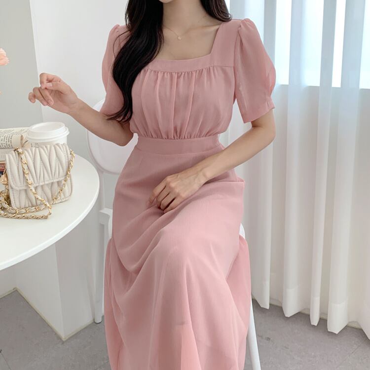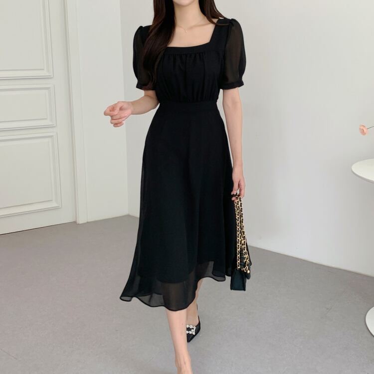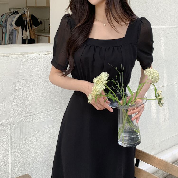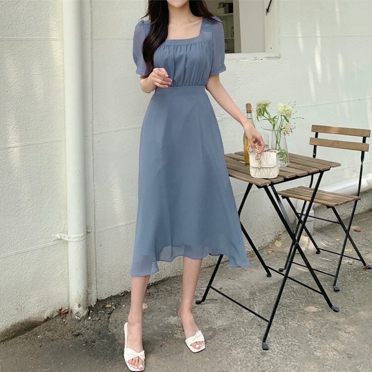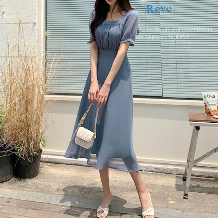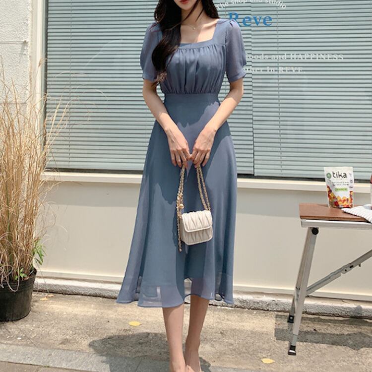 レディース ワンピース フレア ミモレ 半袖 パフスリーブ スクエアネック ノーカラー Aライン フェミニン ウエストマーク ハイウエスト 透け感 コンサバ 大人可愛い きれいめ シンプル 上品 おしゃれ エレガント 存在感 キュート ロマンティック 軽やか 無地 夏 ママ OL デート お出かけ 旅行 レストラン 女子会 休日 ショッピング コンサート 合コン コンパ 婚活 ランチ お呼ばれ オケージョン 脚長 モテ 清楚 ワンサイズ 黒 ブラック ベージュ ピンク ブルー ベーシックカラー 大人カラー