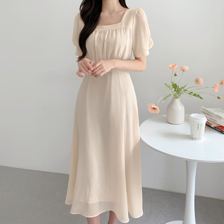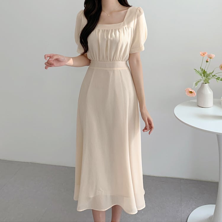 レディースのフレアミモレ丈ワンピースは、パフスリーブとスクエアネックのデザインがフェミニンで大人可愛い雰囲気を演出する一着です。