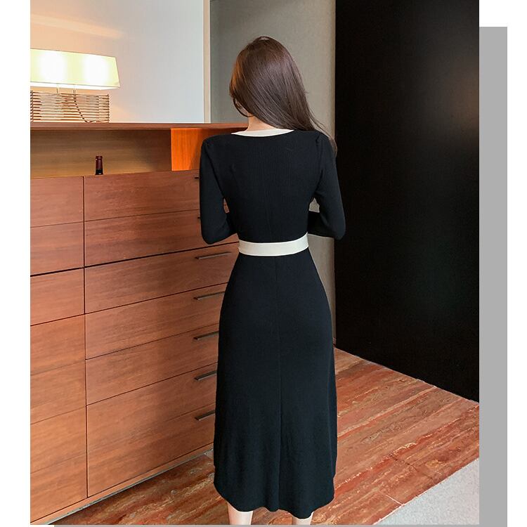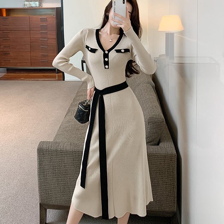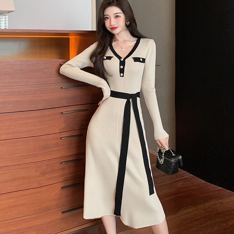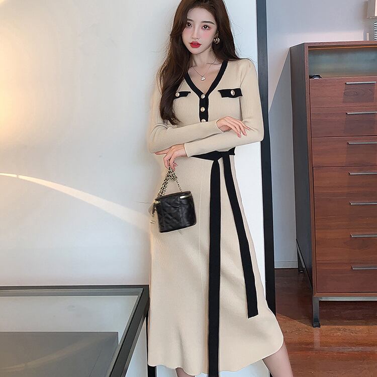 レディース ワンピース ニット フレア ニットワンピ ミモレ 長袖 Vネック 襟なし ノーカラー セミフレア タイト スリム フェミニン ウエストマーク ウエストリボン ハイウエスト ボタン バイカラー 配色 大人可愛い きれいめ 上品 おしゃれ こなれ感 存在感 キュート 軽やか セクシー 春 秋 ママ OL デート お出かけ 旅行 ショッピング 合コン コンパ カフェ 婚活 ランチ お呼ばれ オケージョン コーデ 脚長 着回し モテ ワンサイズ 黒 ブラック ベージュ ベーシックカラー 大人カラー