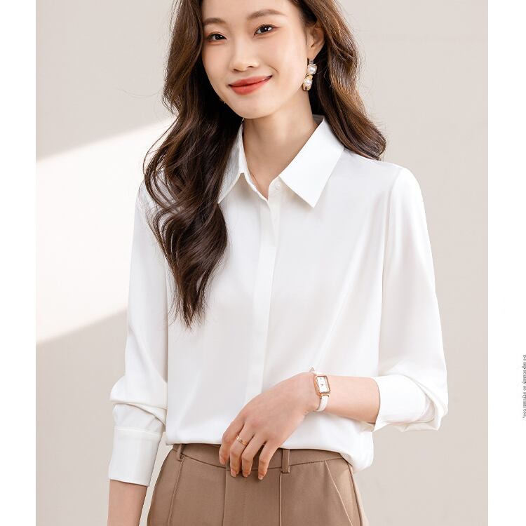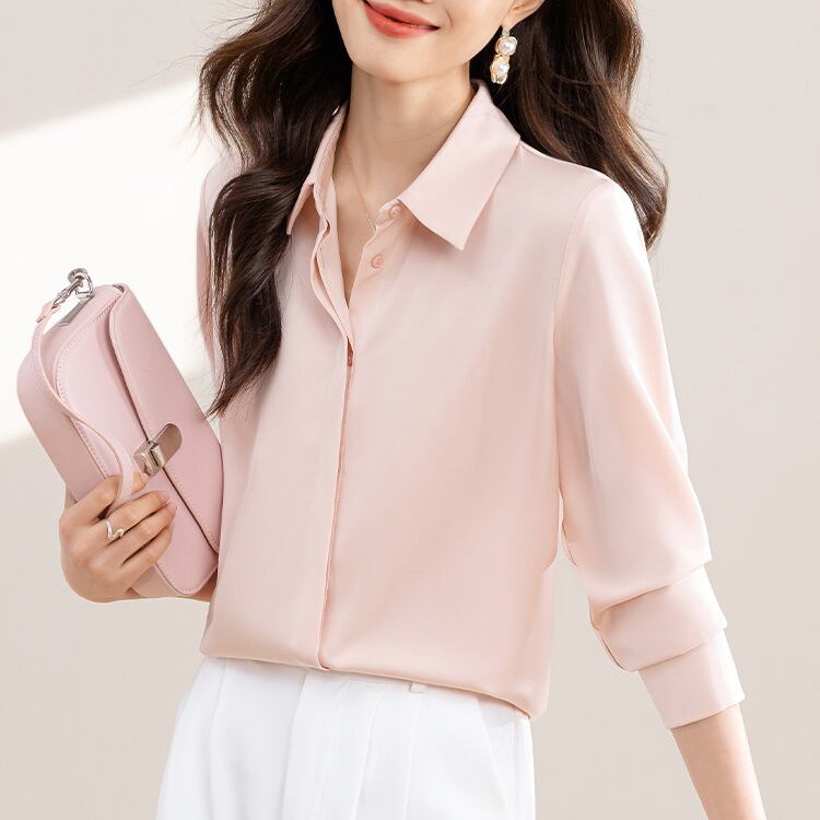レディースのブラウスは、角襟がきちんと感を演出しつつ、スリムなシルエットで女性らしいフェミニンさを引き立てる一枚です。