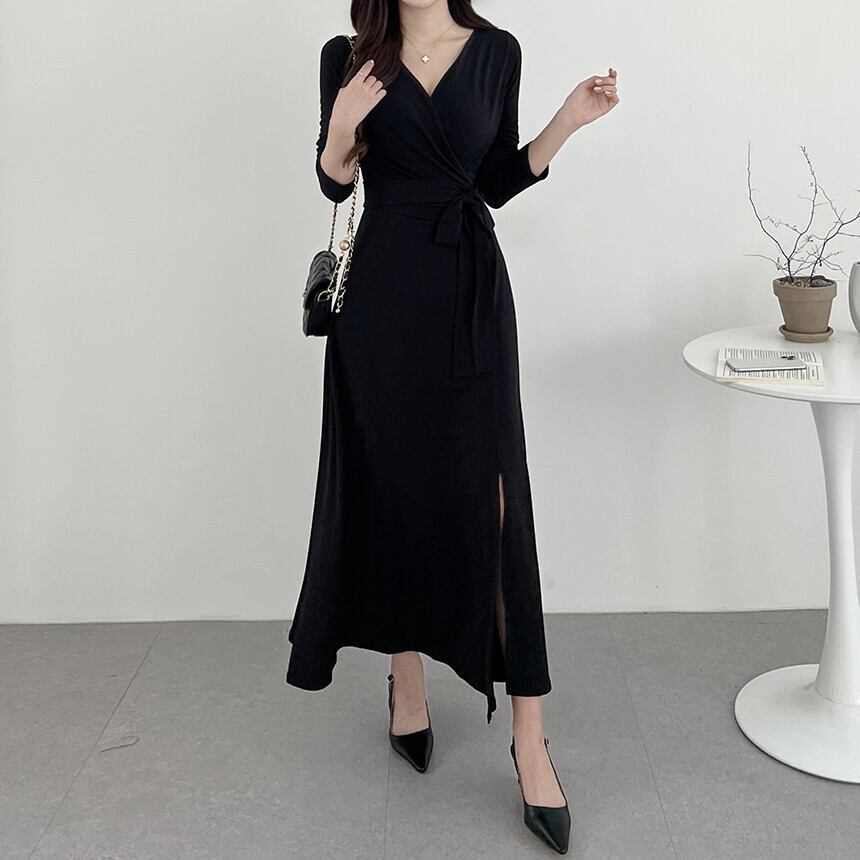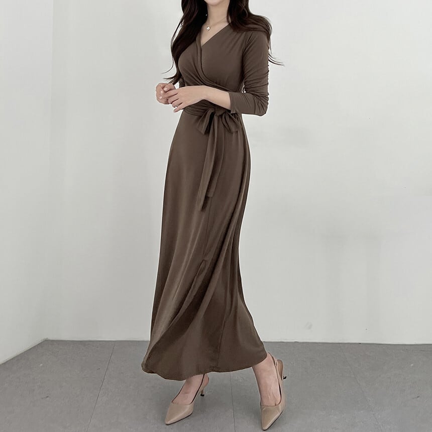 レディース ワンピース ロングワンピ ドレス 長袖 Vネック カシュクール フレア タイト スリム 切り替え ドレープ フェミニン ウエストマーク ウエストリボン スリット ハイウエスト コンサバ 大人可愛い きれいめ シンプル 上品 おしゃれ かっこいい こなれ感 エレガント 存在感 都会的 軽やか セクシー 無地 春 秋 OL デート お出かけ 旅行 レストラン 女子会 休日 ショッピング 発表会 コンサート 合コン コンパ カフェ ランチ お呼ばれ オケージョン ワンサイズ 黒 ブラック ブラウン