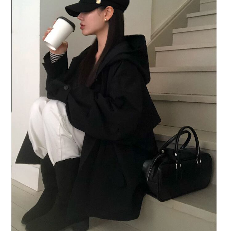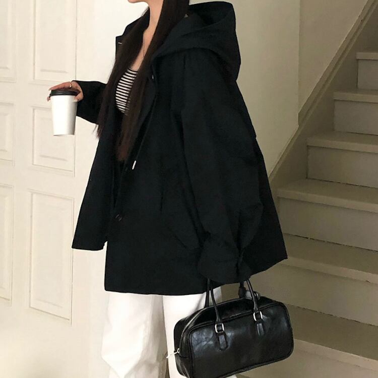 レディース ジャケット アウター 上着 前開き トレンチ ミディアム 長袖 ボリューム袖 ドロップショルダー フード ワイド オーバーサイズ ストリート ポケット 大人可愛い シンプル カジュアル おしゃれ こなれ感 ラフ 存在感 ベーシック ナチュラル 軽やか 無地 春 秋 デート お出かけ アウトドア キャンプ 旅行 公園 女子会 休日 ショッピング フェス モノトーン オルチャン 楽ちん 体型カバー 普段使い 着回し 流行 フリーサイズ 黒 ブラック ベーシックカラー 大人カラー