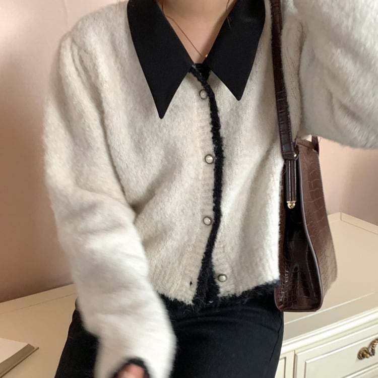 Vネック×角襟のクラシカルなデザインに、上品な金ボタンをあしらい、シンプルながらも存在感のある一枚に仕上がっています。