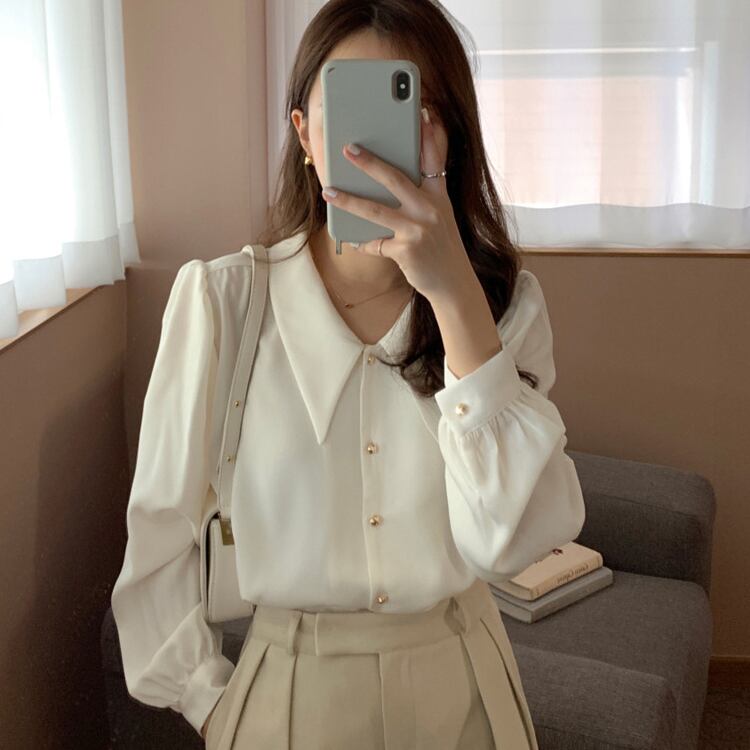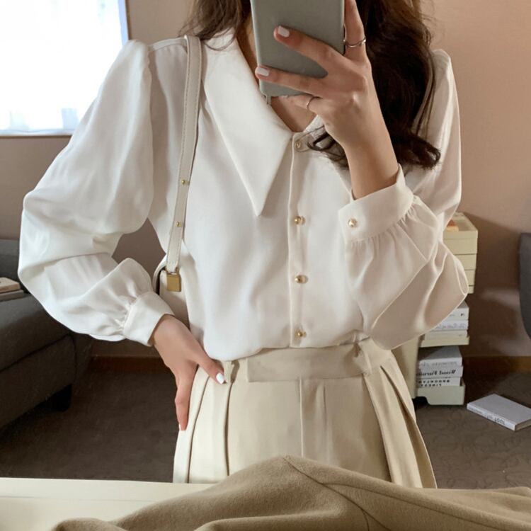 レディース トップス シャツ ブラウス 前開き 長袖 ボリューム袖 パフスリーブ Vネック 襟付き 角襟 金ボタン かわいい 大人可愛い きれいめ シンプル 上品 おしゃれ こなれ感 ガーリー 存在感 キュート クラシカル ベーシック ロマンティック 清潔感 涼しげ 軽やか 爽やか 無地 春 秋 ママ デート お出かけ 旅行 女子会 休日 合コン コンパ カフェ 婚活 ランチ お呼ばれ オケージョン 重ね着 コーデ 普段使い レイヤード モテ 清楚 S M L XL 2XL 白 ホワイト 黒 ブラック