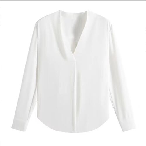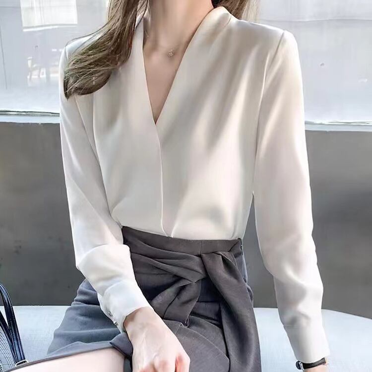 すっきりとしたVネックが好印象のノーカラーブラウス。