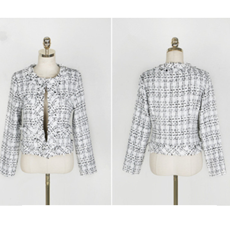 レディース ジャケット 上着 羽織 前開き クロップド丈 長袖 ラウンドネック 襟なし ノーカラー スリム 細身 フェミニン かわいい 大人可愛い きれいめ 上品 おしゃれ かっこいい こなれ感 エレガント 存在感 フォーマル 都会的 ラグジュアリー チェック 格子柄 春 秋 発表会 授業参観 ママ OL 通勤 デート お出かけ パーティー イベント 旅行 レストラン ホテル コンサート 合コン コンパ 婚活 お呼ばれ オケージョン コーデ モテ M L XL 白 ホワイト 黒 ブラック ベーシックカラー