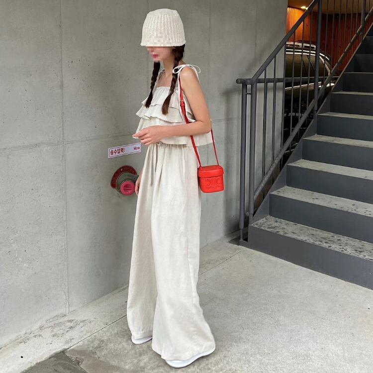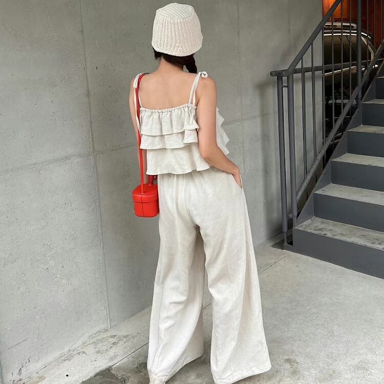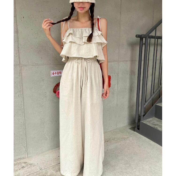 クロップド丈キャミソールとワイドパンツの2点セットで、フェミニンさとラフなリラックス感を兼ね備えた一枚です。