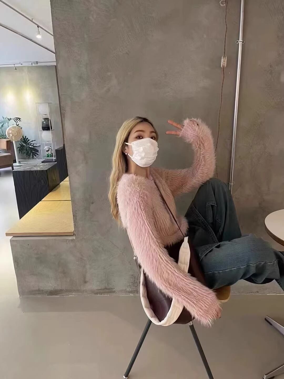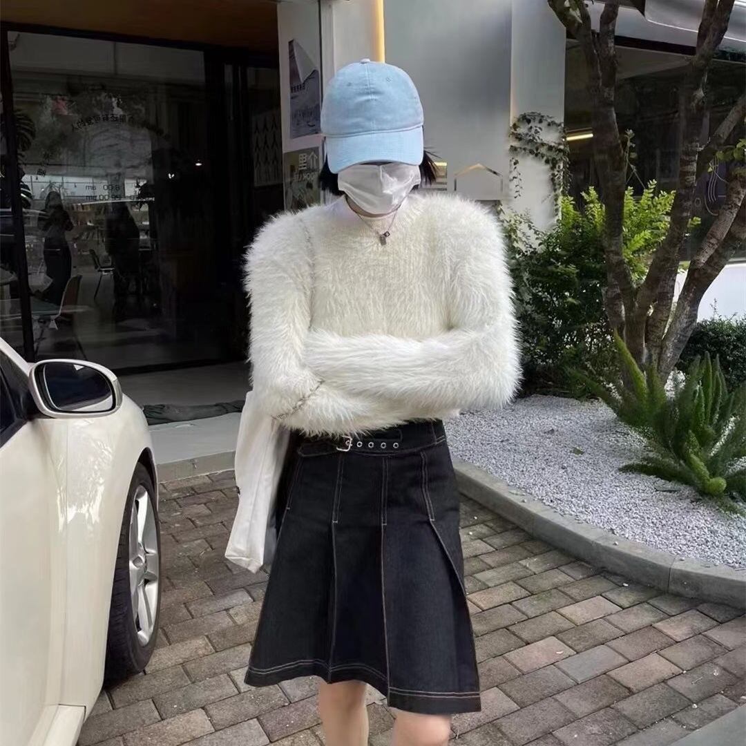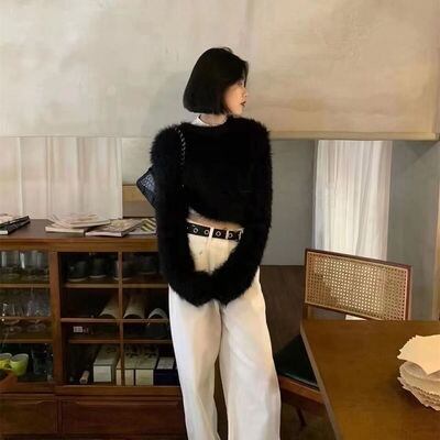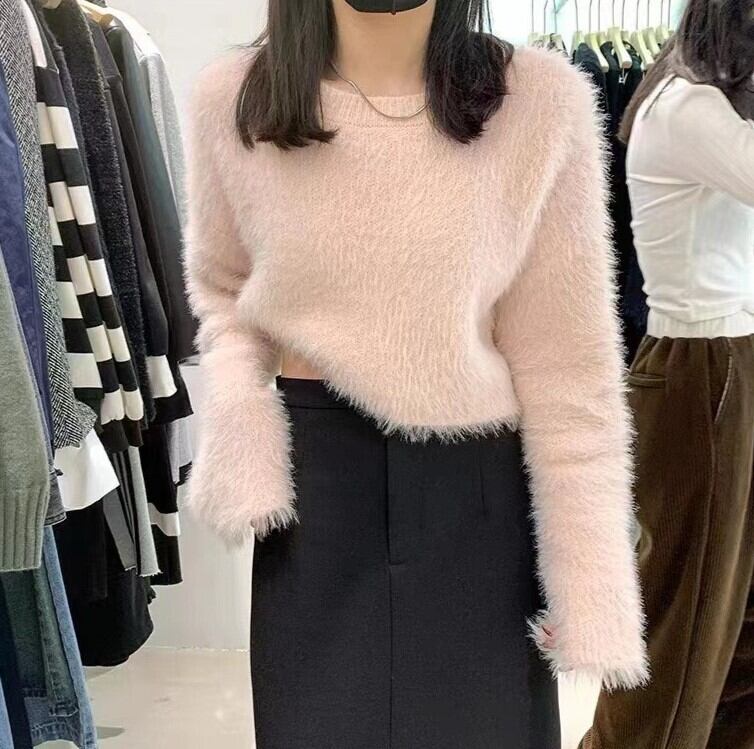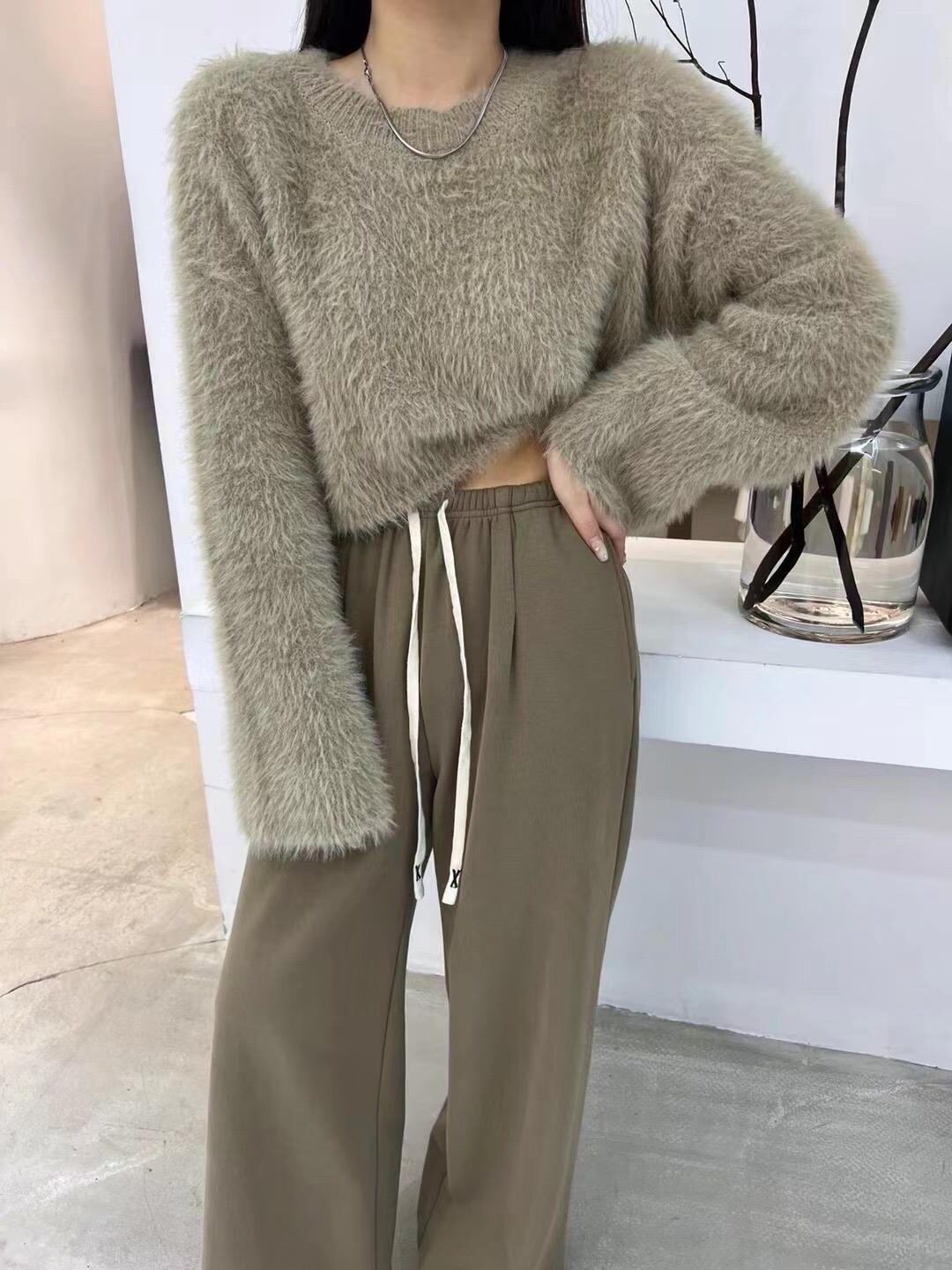 ふんわりとした質感が魅力のシャギーニットトップス。触れたくなるような柔らかさで、シンプルながらも女性らしい雰囲気を引き立てます。ショート丈のデザインはスタイルアップ効果もあり、ハイウエストボトムとの相性も抜群です。