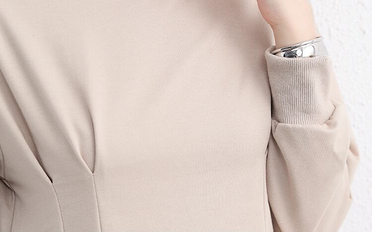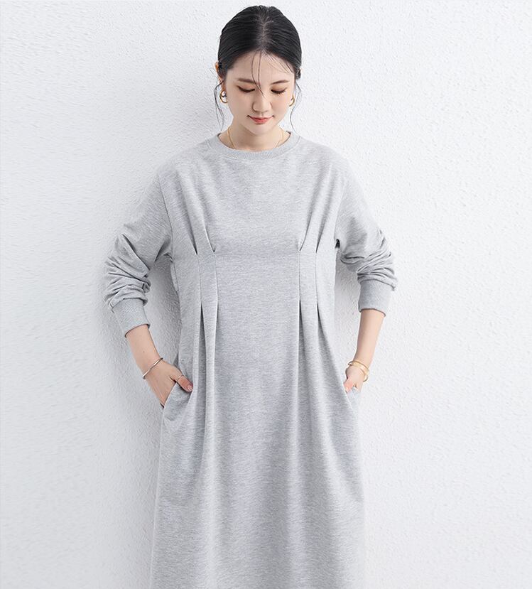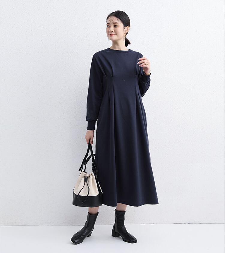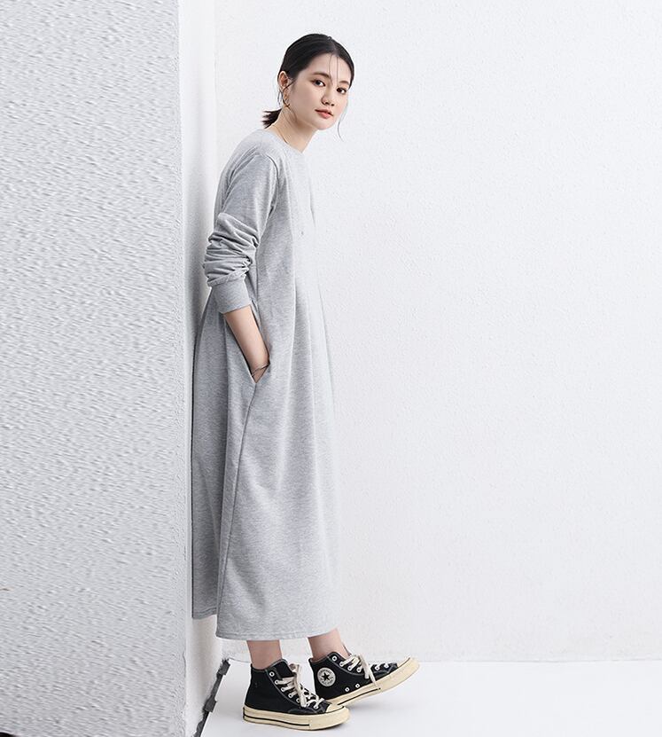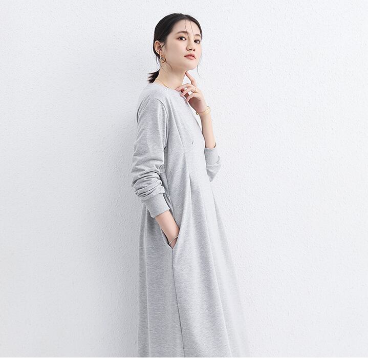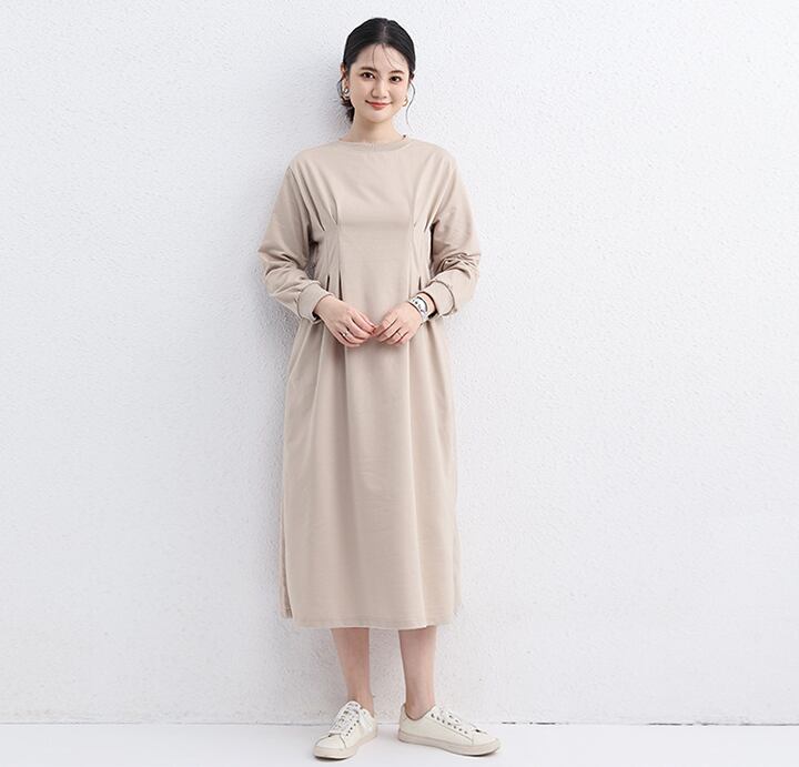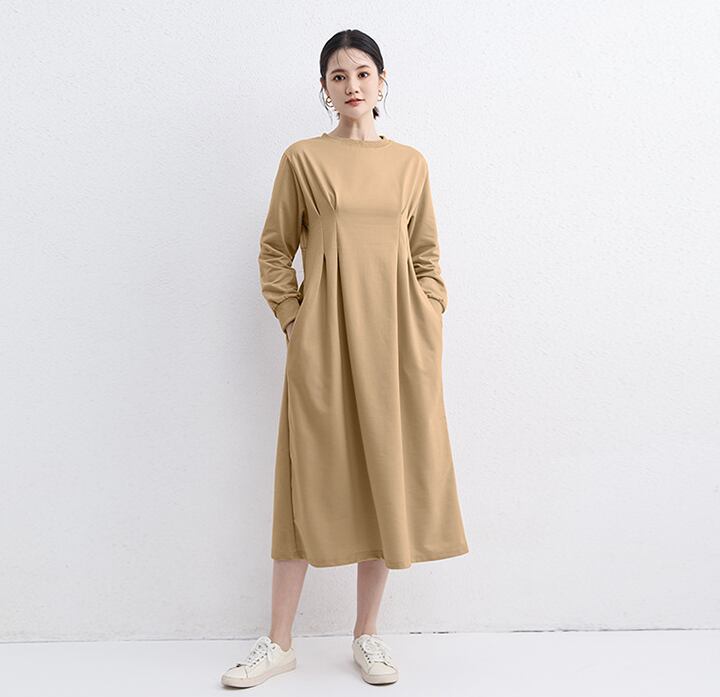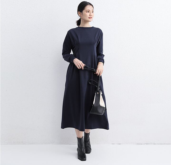 フェミニンでありながら、シンプルでおしゃれなデザインの膝下ミモレ丈ワンピースです。長袖とラウンドネックの組み合わせが、女性らしさを引き立てつつ、リラックスした雰囲気を演出します。スリムなAラインシルエットが体型を美しく見せ、自信を与えてくれるアイテムです。