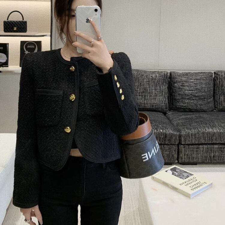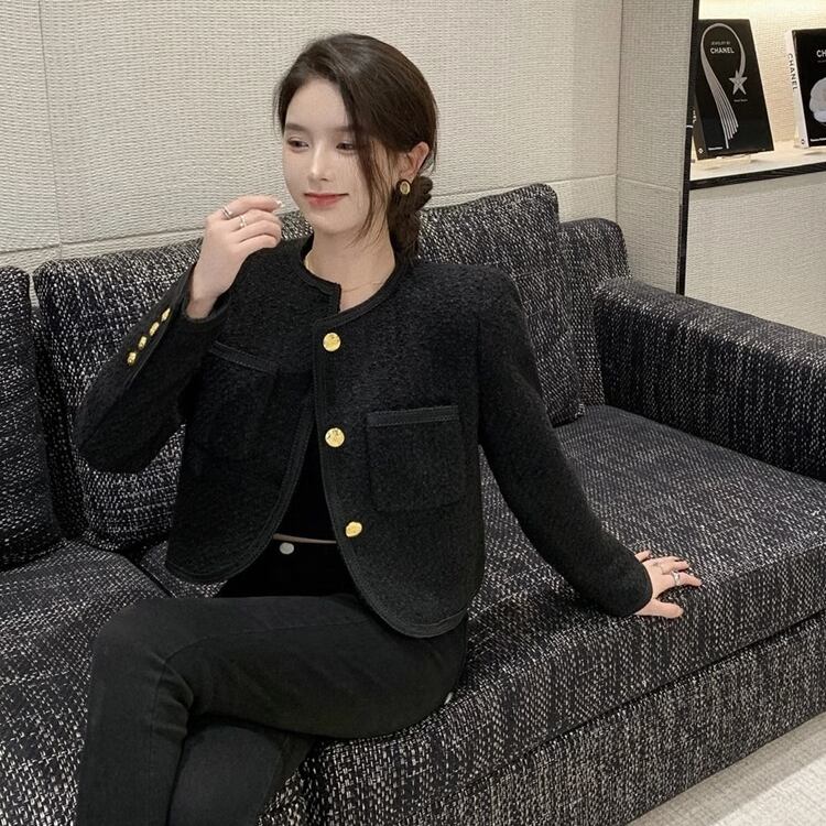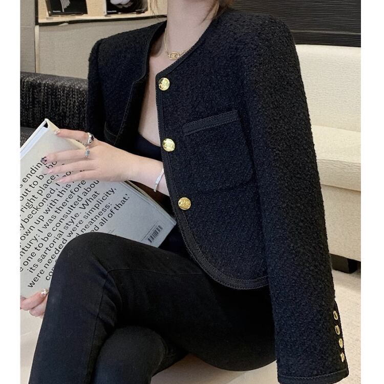 ノーカラー&ラウンドネックのすっきりとしたシルエットに、フロントの金ボタンがアクセントとなり、フェミニンさとエレガントさを引き立てます。