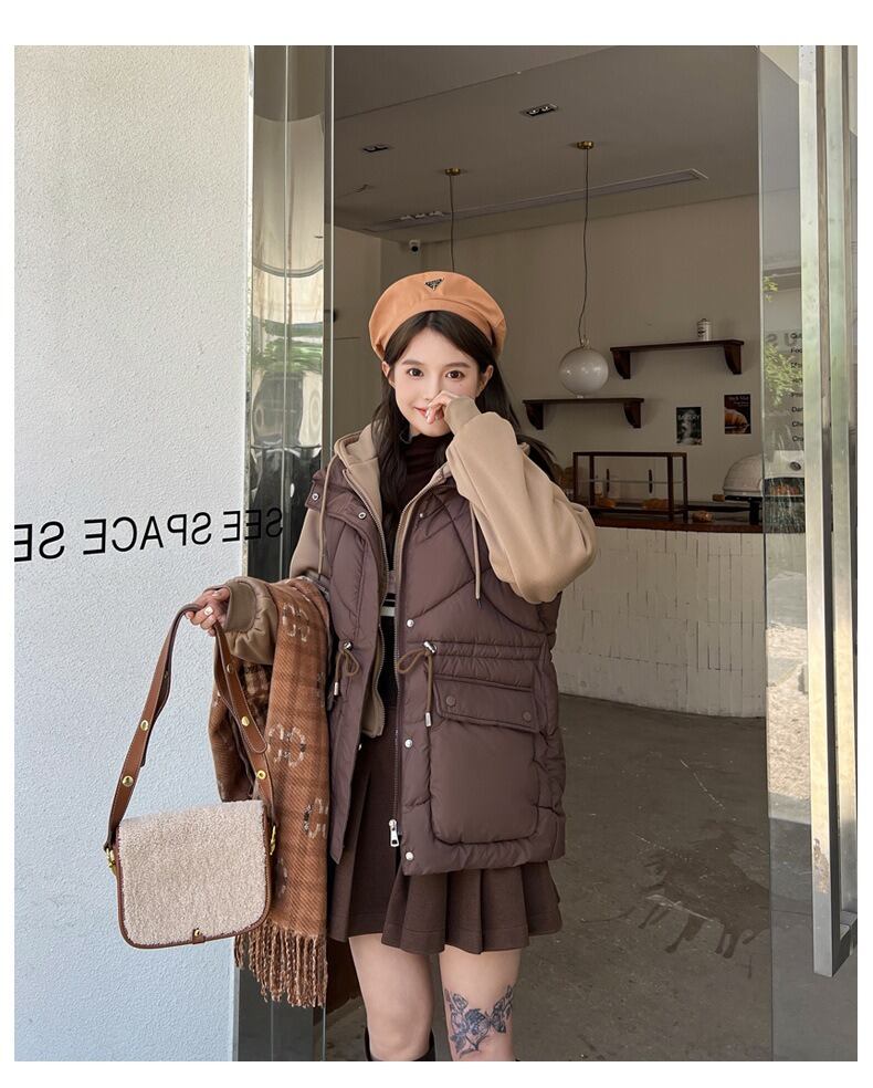 シンプルでカジュアルながらもおしゃれな印象を与える、フード付きのショートダウンコートです。