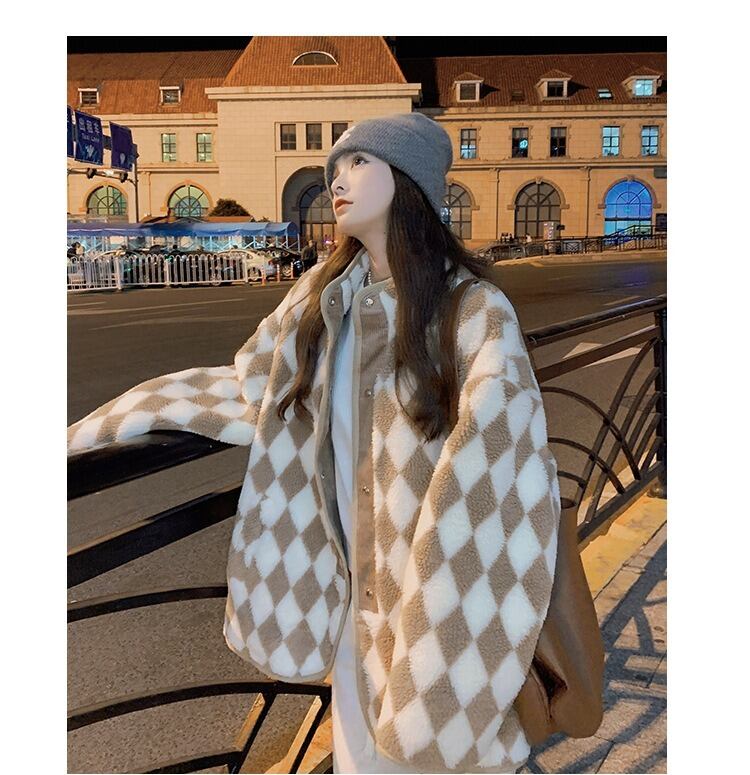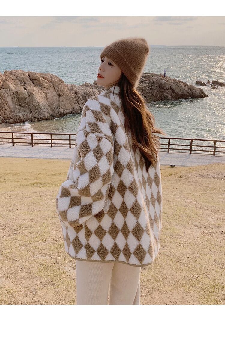 アウター コート ジャケット フリース ショート ショート丈 袖あり 長袖 ワイド ボタン ポケット 厚手 シンプル カジュアル おしゃれ お洒落 ダイヤモンド柄 秋 冬 10代 20代 30代 レディース 女性用 通勤 通学 デート お出かけ 休日 普段使い 韓国 韓国系 コーデ 暖かい 防寒 インスタ映え S M L XL ゆったり ゆる ミルクコーヒー 定番カラー 大人カラー