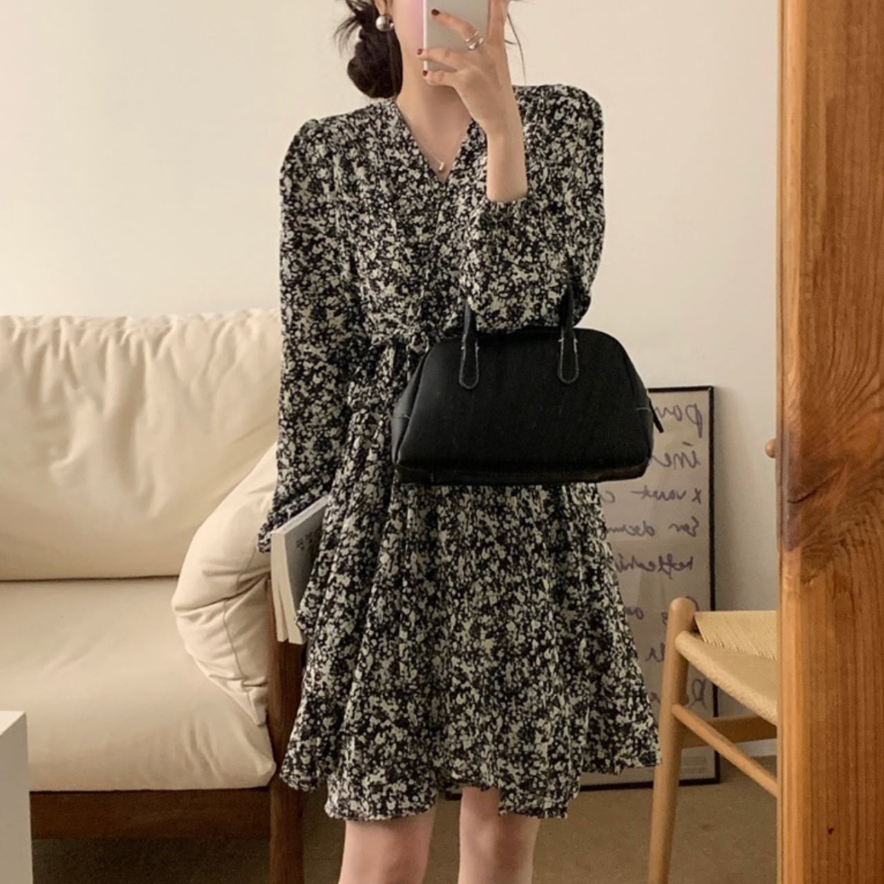 レディース ワンピース 膝上 長袖 ボリューム袖 Vネック 襟なし ノーカラー フレア Aライン フェミニン ウエストマーク ウエストリボン ハイウエスト かわいい 大人可愛い カジュアル こなれ感 主役級 存在感 キュート 清潔感 軽やか 爽やか 花柄 フラワー 総柄 春 秋 ロングシーズン 学生 学校 通学 デート お出かけ イベント リゾート 旅行 女子会 休日 ショッピング 合コン コンパ カフェ ランチ 美脚 脚長 モテ 清楚 インスタ映え ワンサイズ 大人カラー