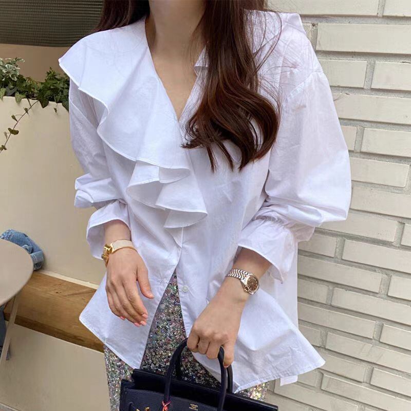 レディース トップス シャツ ブラウス ミディアム 長袖 ドロップショルダー ボリューム袖 ベルスリーブ Vネック 襟付き アシンメトリー フェミニン ボタン 大人可愛い きれいめ こなれ感 個性的 主役級 存在感 都会的 ロマンティック 清潔感 爽やか 無地 春 秋 ロングシーズン 学生 通学 デート お出かけ リゾート 女子会 バカンス ショッピング カフェ ランチ 韓国 楽ちん 体型カバー トレンド 流行 インスタ映え ゆったり フリーサイズ オーバーサイズ 白 ホワイト ピンク 水色 ライトブルー