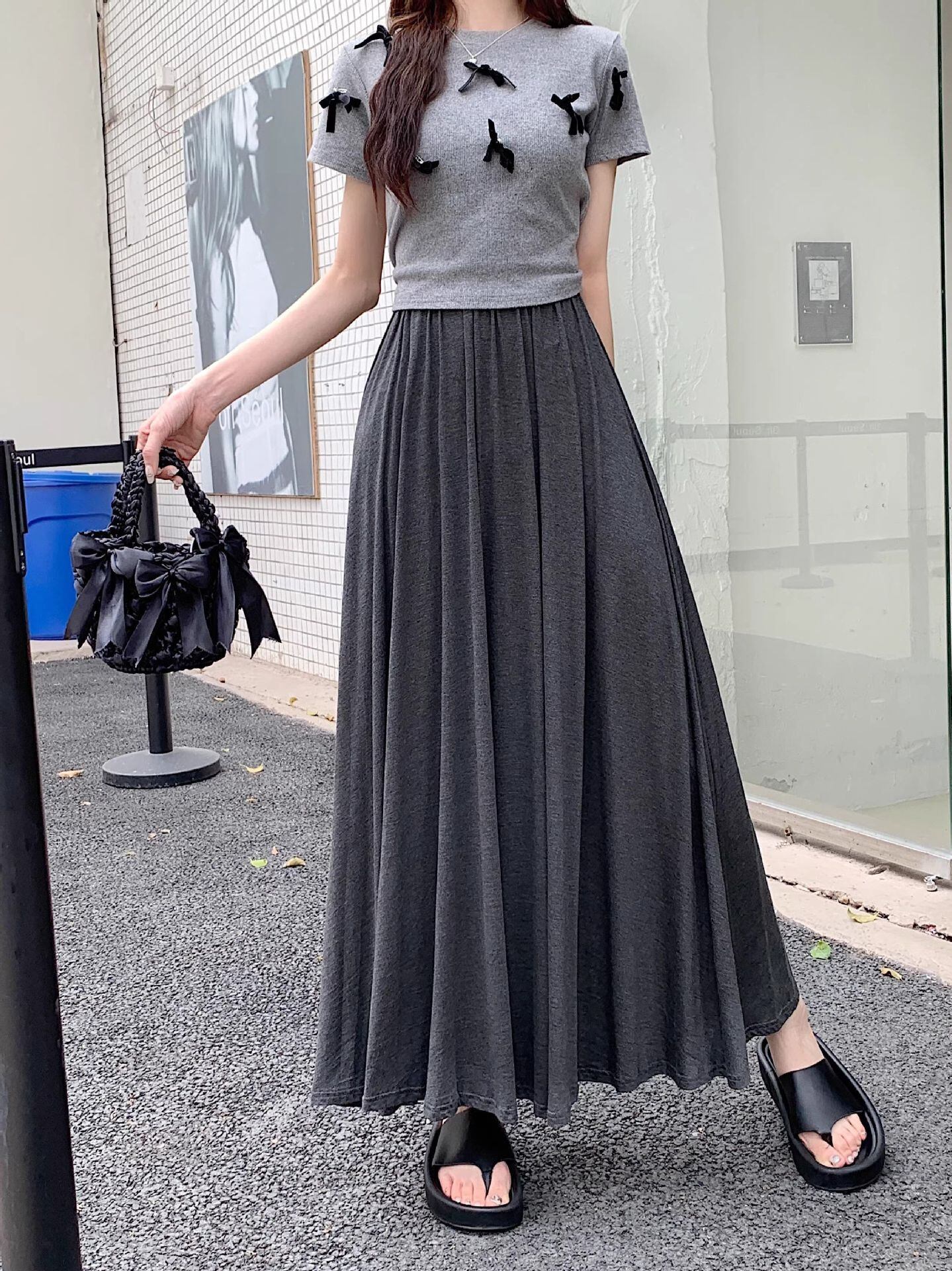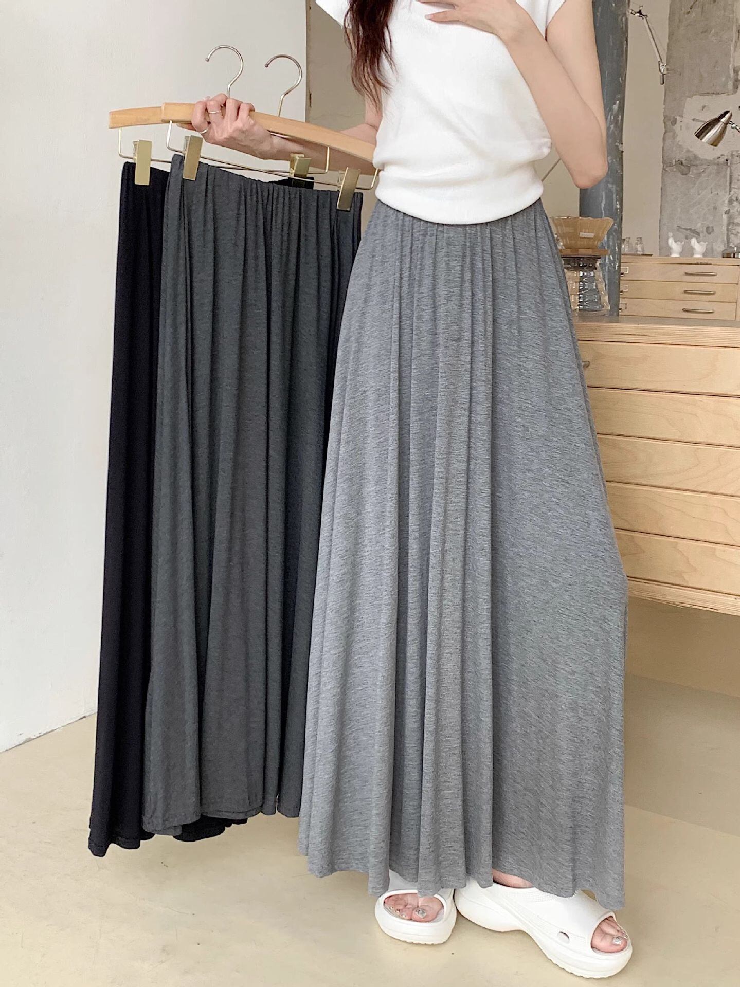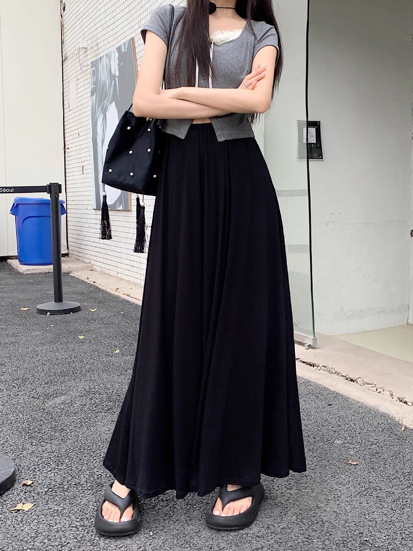 レディース スカート ロングスカート ロング 丈長 フレア Aライン ドレープ ハイウエスト ウエストゴム シンプル カジュアル おしゃれ こなれ感 ラフ 主役級 存在感 抜け感 ベーシック ナチュラル リラックス 無地 春 夏 秋 ロングシーズン ママ 学生 学校 通学 デート お出かけ リゾート 旅行 女子会 休日 ショッピング カフェ モノトーン 楽ちん 体型カバー 脚長 普段使い 着回し 定番 S M L XL ゆったり 黒 ブラック ライトグレー ダークグレー ベーシックカラー 大人カラー