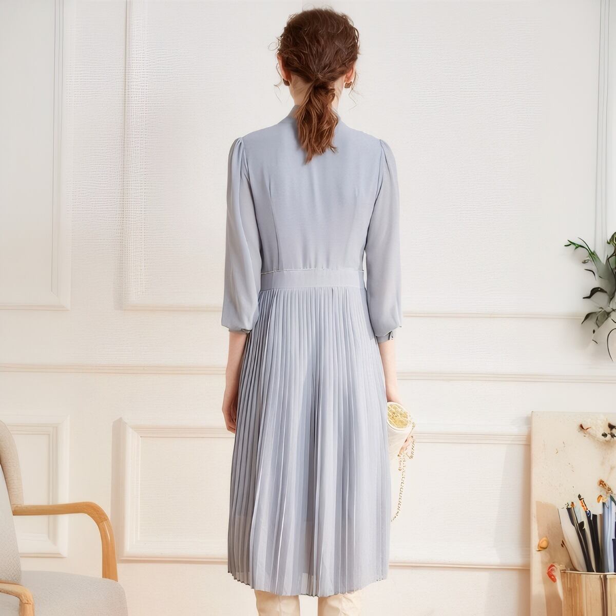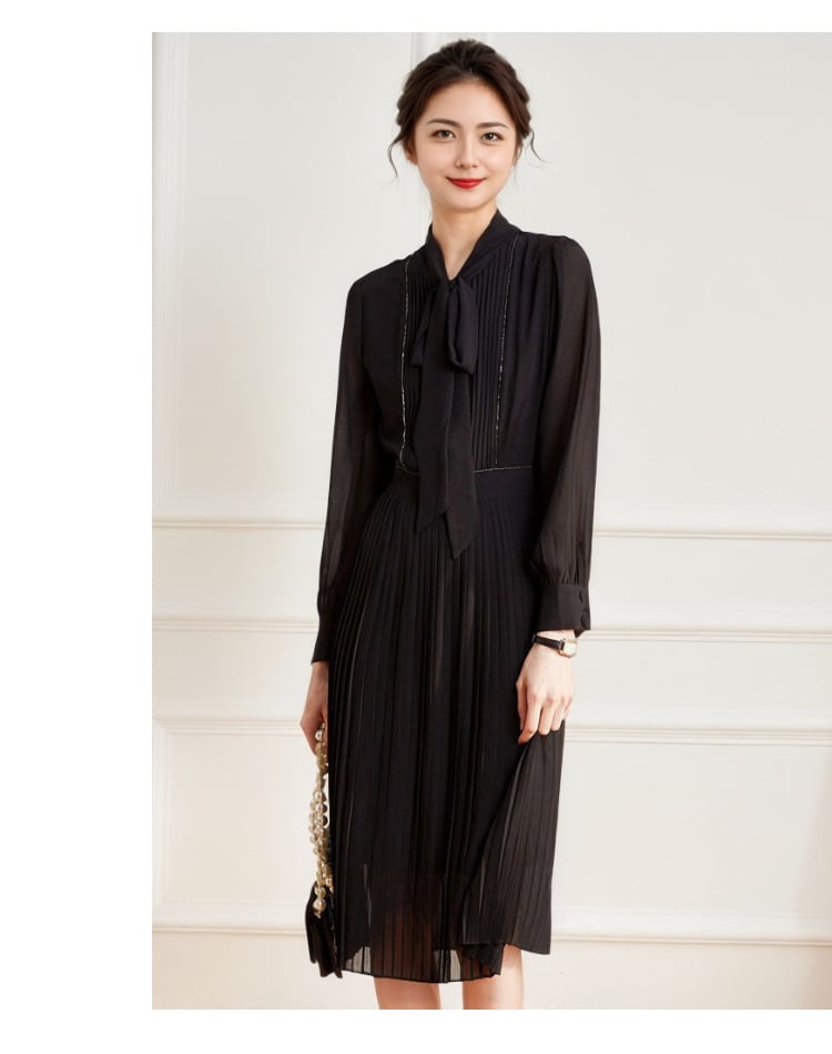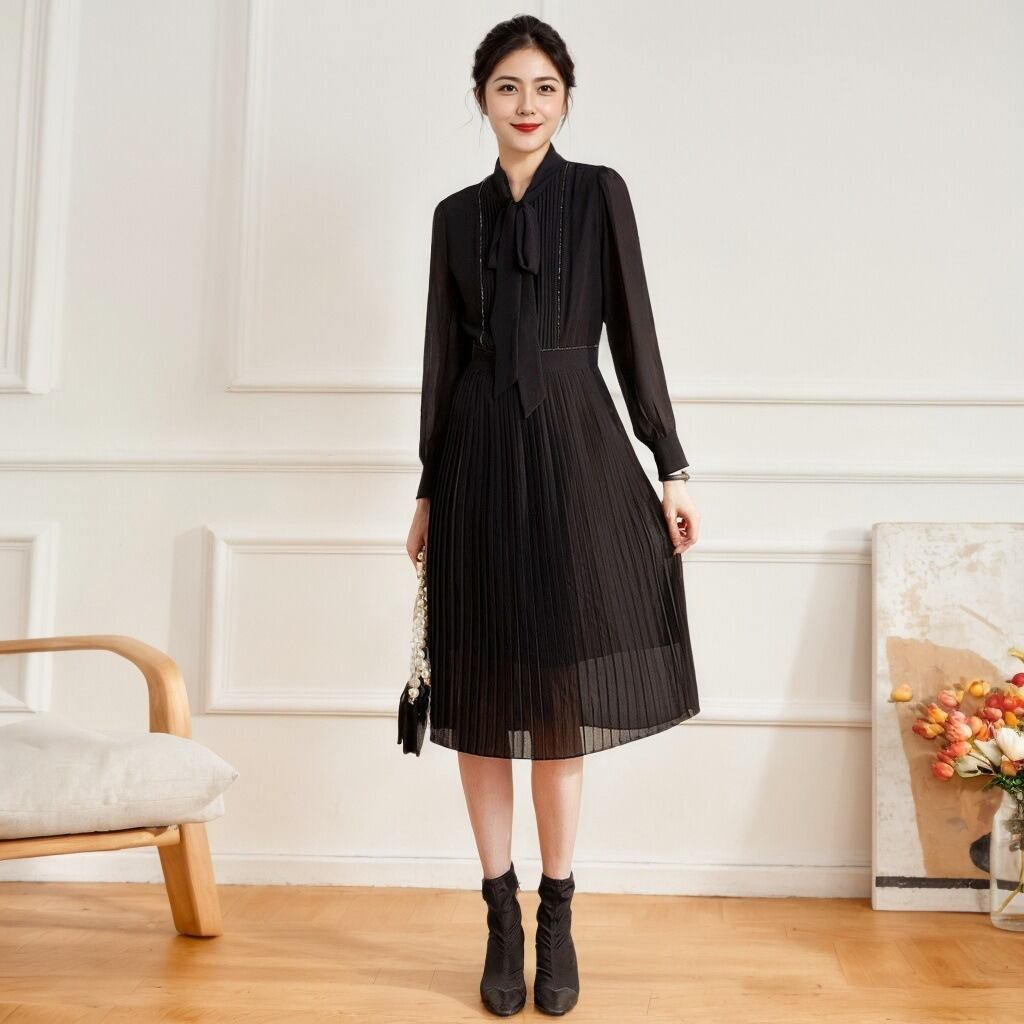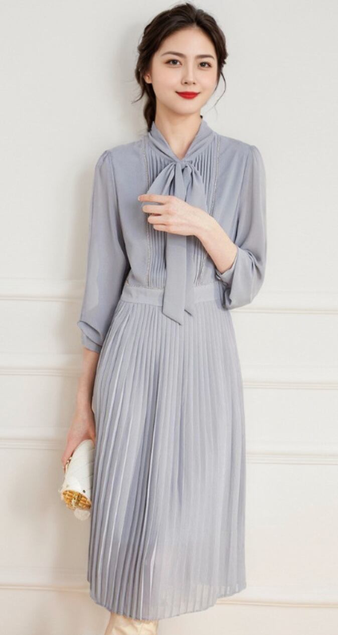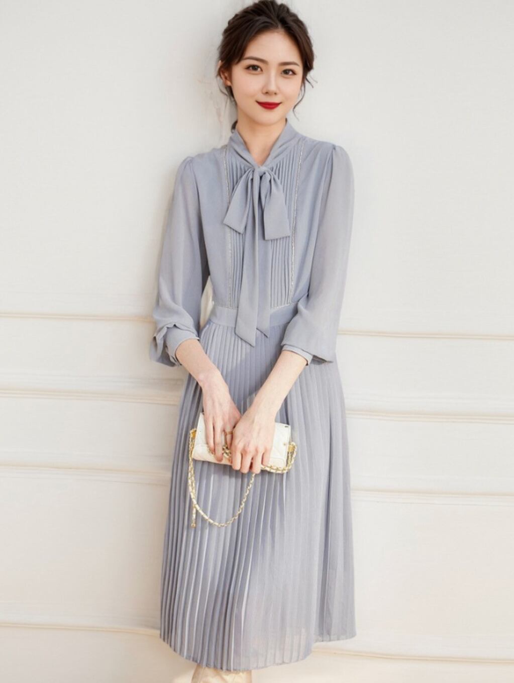 細かなプリーツが特徴的な、上品な印象のロングワンピース。胸元のボウタイリボンとプリーツのデザインが、顔周りを華やかに見せ、動くたびに美しい揺れ感を演出します。