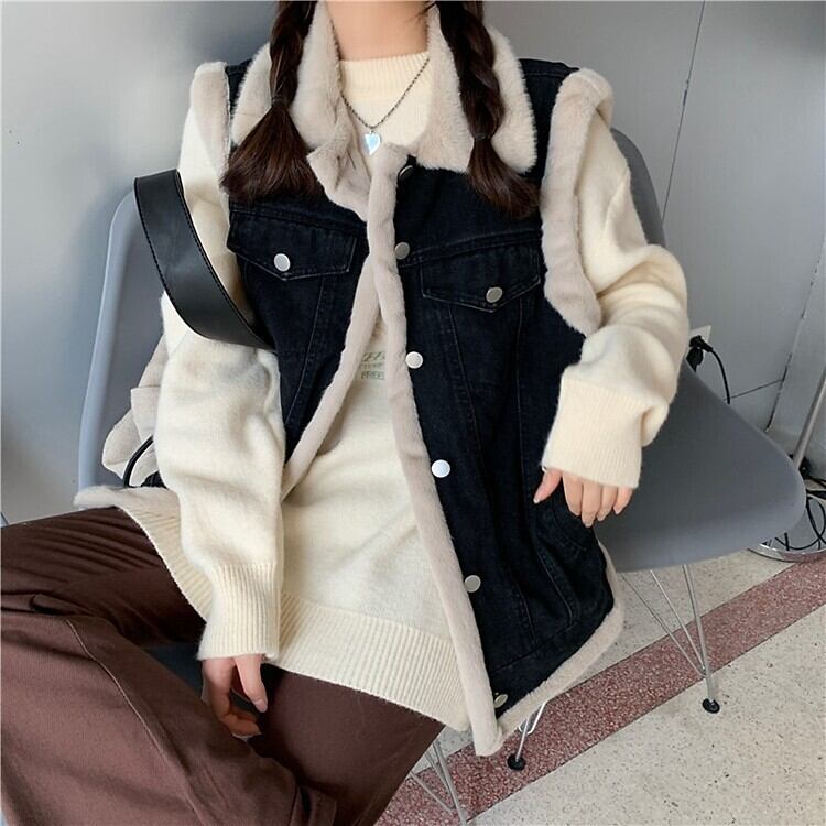 ベスト アウター 上着 レディース デニム ファー 袖なし ノースリーブ 襟付き ワイド ストレート もこもこ ふわふわ ポケット 前開き ボタン デニム ブルーデニム フェイクファー 厚手 ベロア 異素材ミックス ポリエステル かわいい 大人可愛い カジュアル おしゃれ レトロ こなれ感 メンズライク マニッシュ ボーイッシュ 個性的 存在感 ベーシック 無地 秋 冬 ママ マタニティ 学生 学校 通学 デート お出かけ ショッピング 防寒 体型カバー 普段使い 着回し S M L ブラック ブルー
