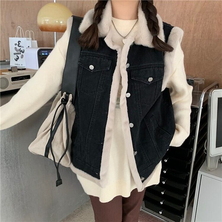 寒くなり始めた季節にぴったりの、デニムとフェイクファーの組み合わせが魅力的なベスト。