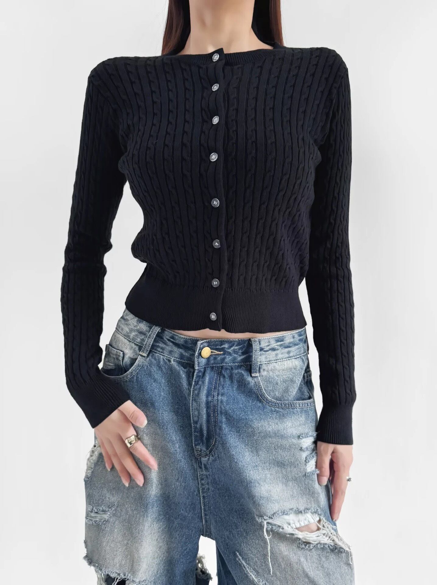 いつものコーデに羽織るだけで、ぐっと今年らしい印象になるクロップド丈のカーディガン。クラシックなケーブル編みが上品な表情をプラスし、どんなボトムスとも相性抜群です。ハイウエストのパンツやスカートと合わせれば、スタイルアップ効果も抜群。ボタンを留めてトップスとして着るのもおすすめです。着こなし次第で、カジュアルにもきれいめにもなる万能アイテムです。