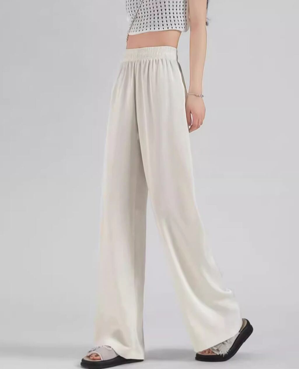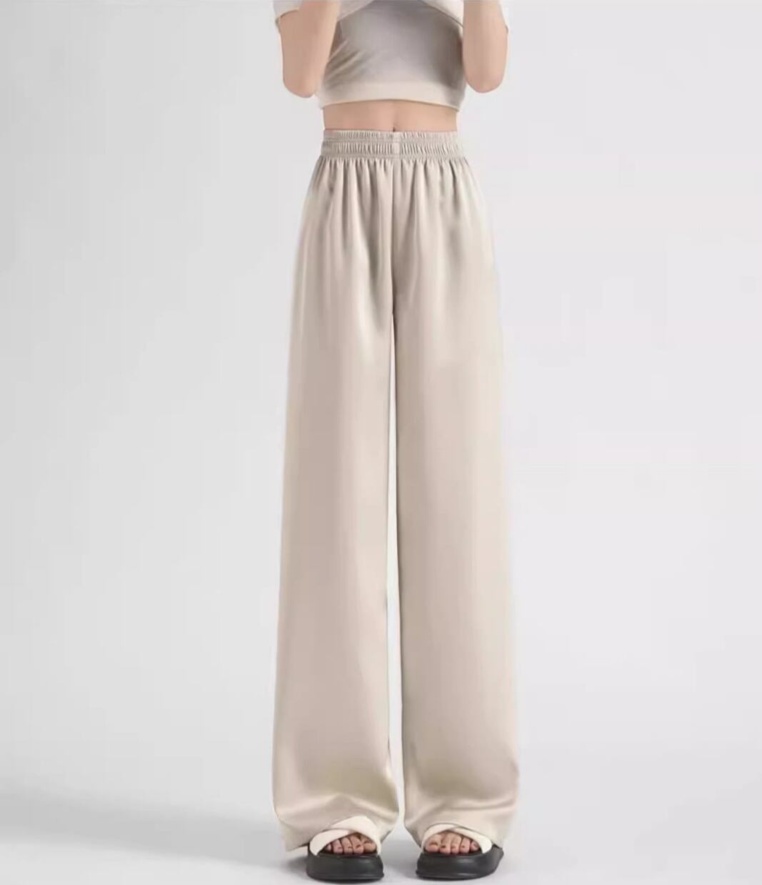 光沢が絶妙な、抜け感のあるワイドパンツ。歩くたびに揺れるドレープが、こなれた大人のリラックススタイルを演出します。ゆとりのあるシルエットながらも、広がりすぎないデザインなので、ボリュームのあるトップスと合わせてもバランス良く着こなせます。サンダルやスニーカーでカジュアルダウンしたり、ヒールと合わせてドレッシーに着こなしたりと、足元で印象を変えるのも楽しい一枚です。