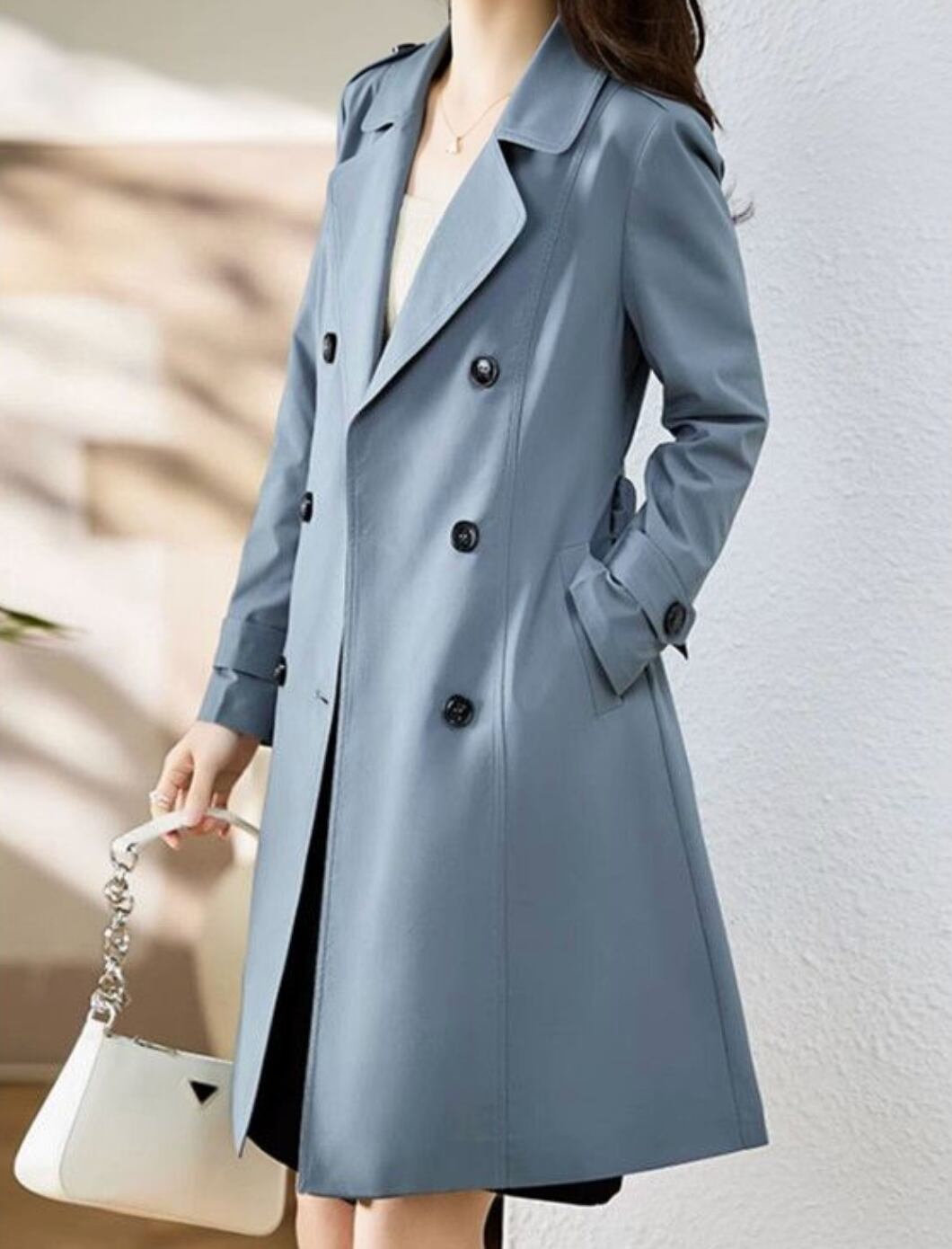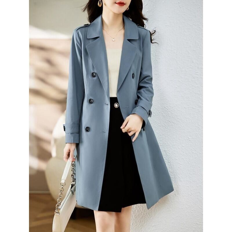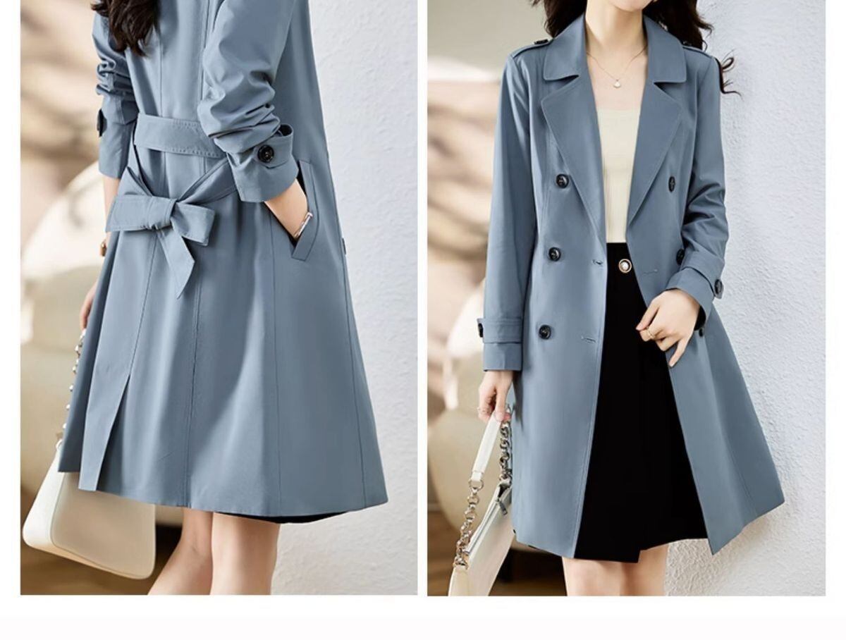 シンプルでエレガントなデザインの前開きタイプトレンチコート。膝上のミディアム丈で、Vネックや角襟がフェミニンな印象を与えながら、Aラインシルエットが体型を美しくカバーします。ベルト付きでウエストを引き締めることで、より洗練されたスタイルが楽しめます。バックスリットが動きやすさをアップさせ、デートやオフィススタイルにもぴったりです。