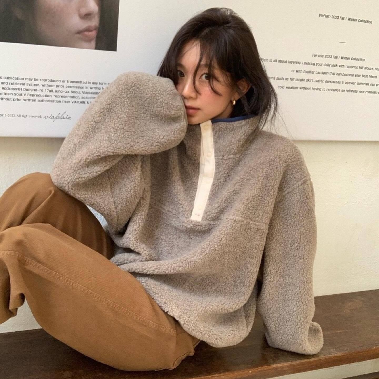 レディース トップス プルオーバー トレーナー スウェット ショート クロップド丈 長袖 ドロップショルダー ハイネック ポロカラー ハーフボタン オーバーサイズ ストリート フリース ボア かわいい 大人可愛い きれいめ シンプル カジュアル おしゃれ こなれ感 ラフ ボーイッシュ ルーズ 抜け感 ベーシック ナチュラル リラックス 無地 秋 冬 ママ 学生 公園 休日 韓国 オルチャン 楽ちん 暖かい 防寒 体型カバー 普段使い 着回し トレンド S M L ゆったり ゆる ベージュ キャメル