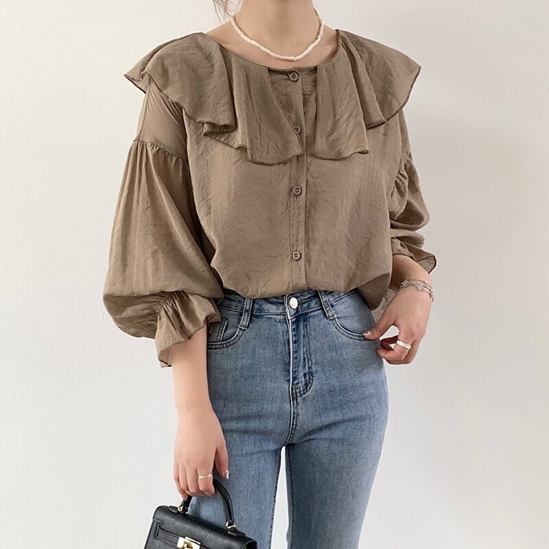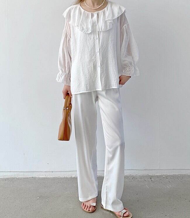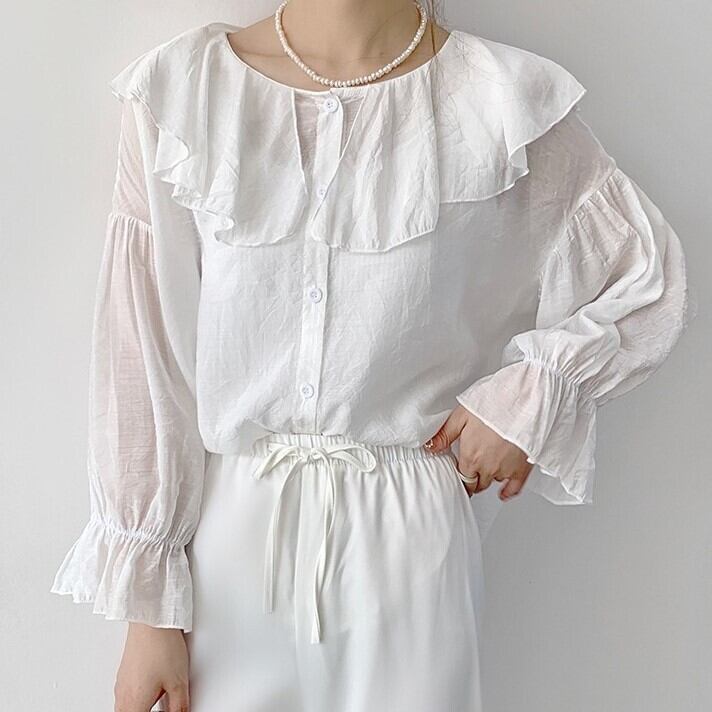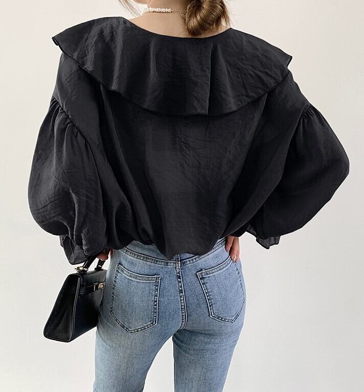 ふんわりとしたキャンディスリーブとフリルカラーが印象的な大人可愛いブラウス。オーバーサイズのシルエットとドロップショルダーがこなれ感を演出し、ゆったりとした着心地ながらも上品さを兼ね備えています。
