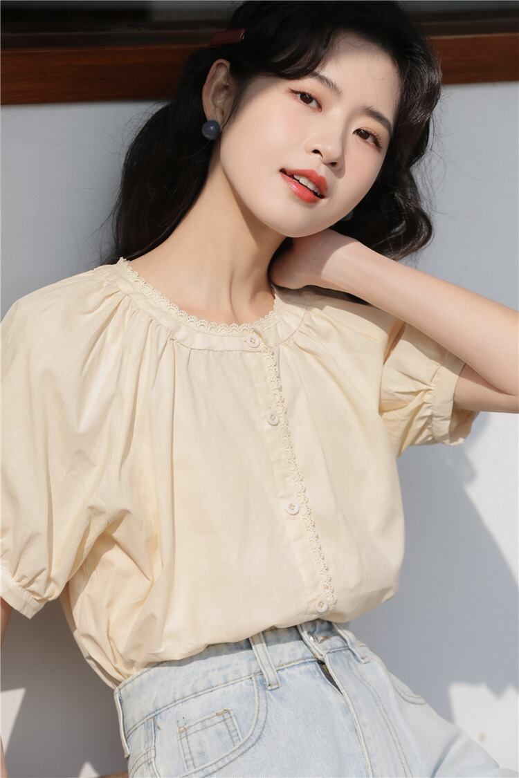 繊細なスカラップレースが華やかさを添える半袖ブラウス。ラウンドネックと前開きボタンのシンプルなデザインに、ふんわりとしたパフスリーブとギャザーがフェミニンな雰囲気を演出します。