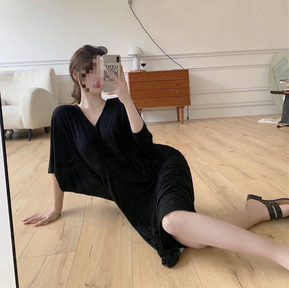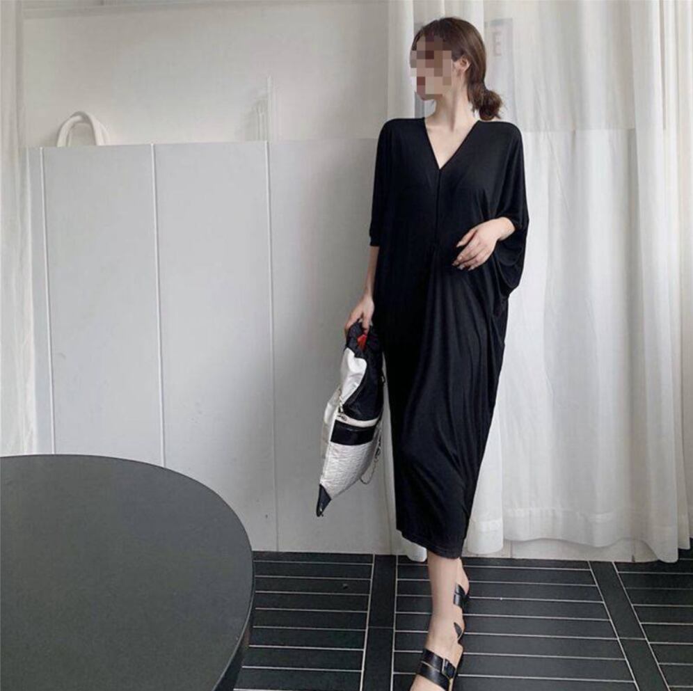 シンプルでありながらエレガントなミモレ丈のワンピース。半袖のVネックデザインが女性らしい清潔感を引き立て、フレアシルエットがリラックスした着心地。
