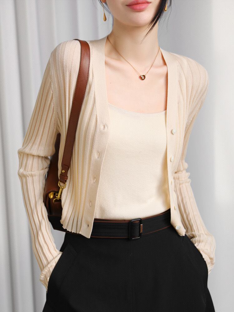 デコルテを美しく見せるVネックラインと、繊細なリブ編みが女性らしい雰囲気を引き立てるカーディガン。一枚でプルオーバーとして着るだけで、エレガントなスタイルが完成します。パンツスタイルでクールに、スカートでフェミニンにと、合わせるアイテムによって様々な表情を見せてくれます。ワードローブに欠かせない、着回し力と上品さを兼ね備えた一着です。