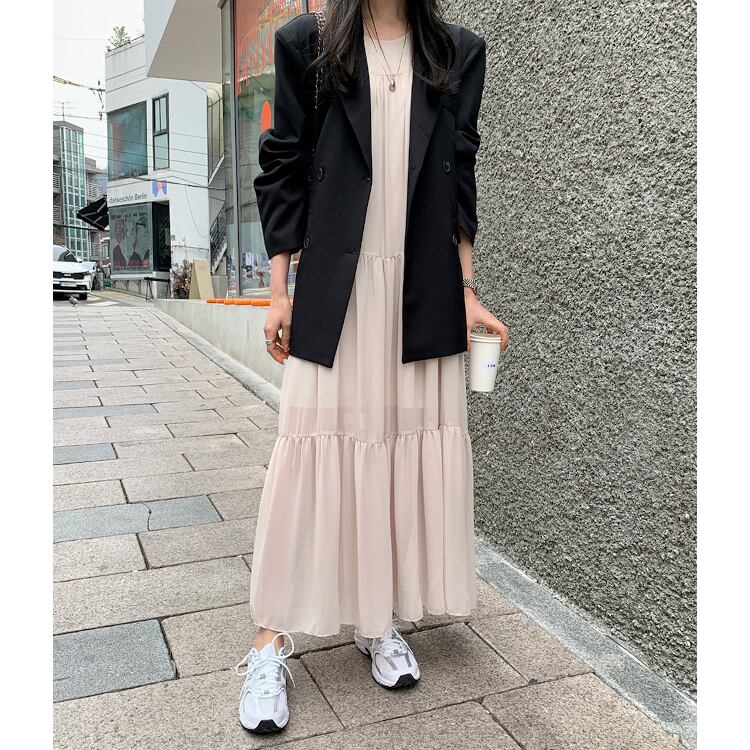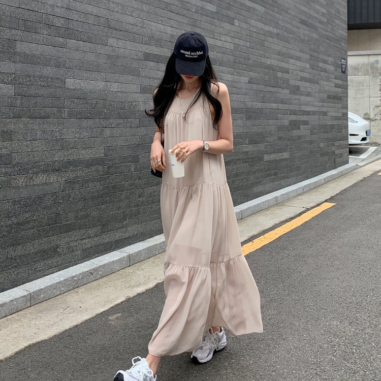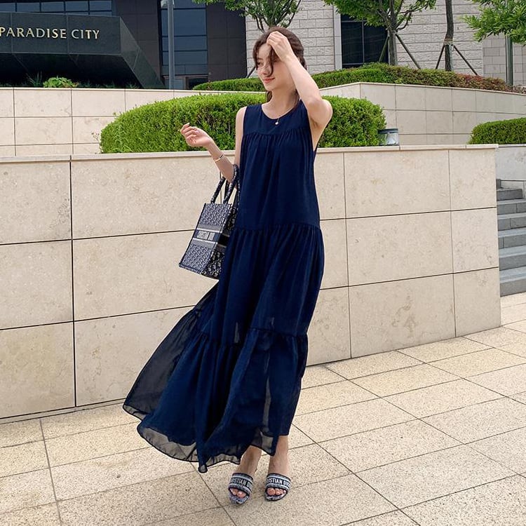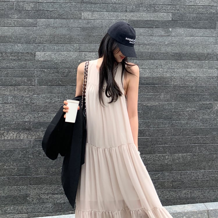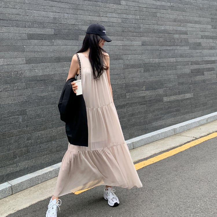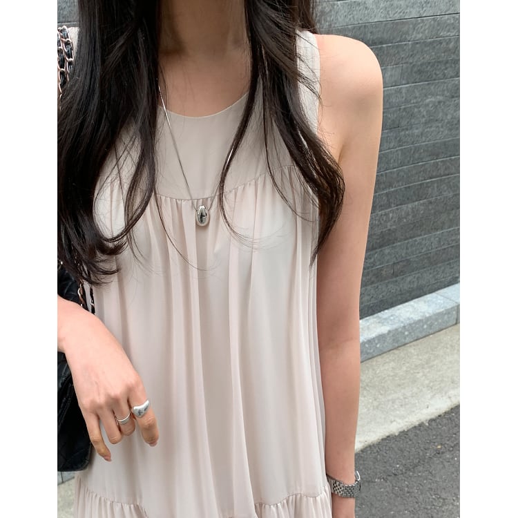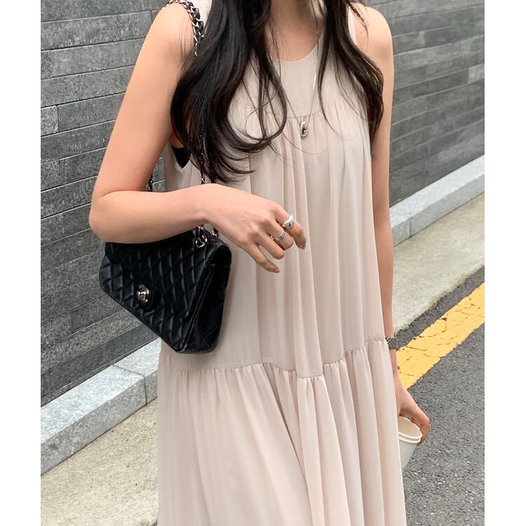 ノースリーブ&ラウンドネックのシンプルなデザインに、ティアードの切り替えデザインがほどよい存在感をプラス。