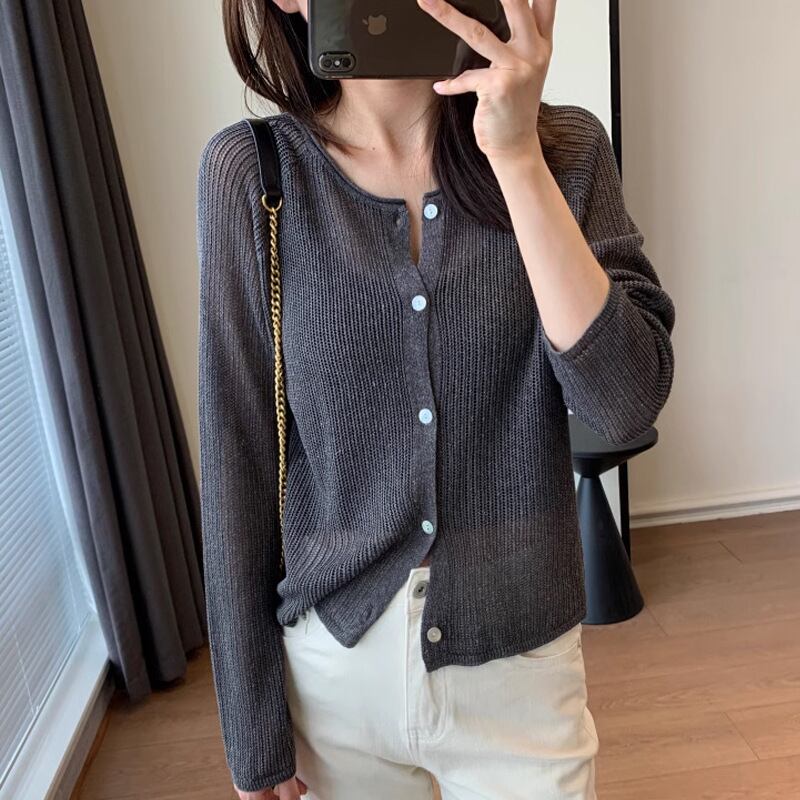 レディース トップス ニット カーディガン 長袖 ラウンドネック 襟なし ノーカラー スリム ストレート フェミニン 前開き 透け感 ボタン 透かし編み 大人可愛い シンプル カジュアル 上品 おしゃれ 存在感 ベーシック 軽やか 無地 春 夏 秋 ロングシーズン ママ オフィス OL 通勤 学生 学校 デート お出かけ 旅行 公園 女子会 休日 ショッピング コンサート カフェ ランチ 重ね着 コーデ 普段使い 着回し モテ 冷房対策 ワンサイズ グレー オフホワイト ベーシックカラー 大人カラー