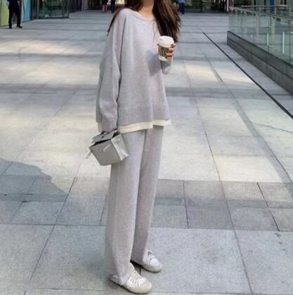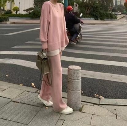 華やかでありながらもリラックスした印象を与える、トップスとパンツのセットアップのご紹介です。このルームウェアは、トレーナーやスウェットといったカジュアルなスタイルを楽しめるアイテムで、長袖やラウンドネックのデザインが特徴。ウエストゴムのジョガーパンツは、快適さとスタイルを両立させており、サイドスリットがトレンド感をプラスしています。