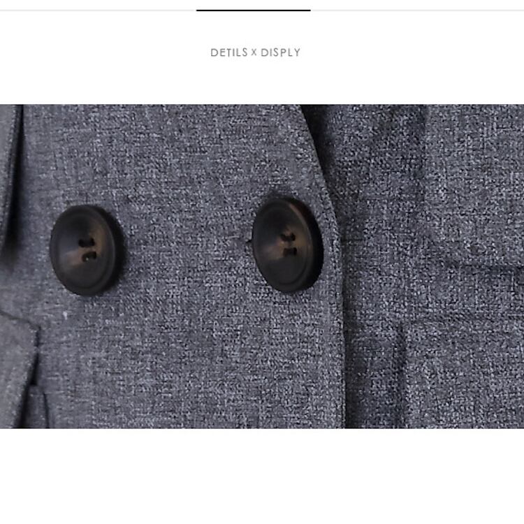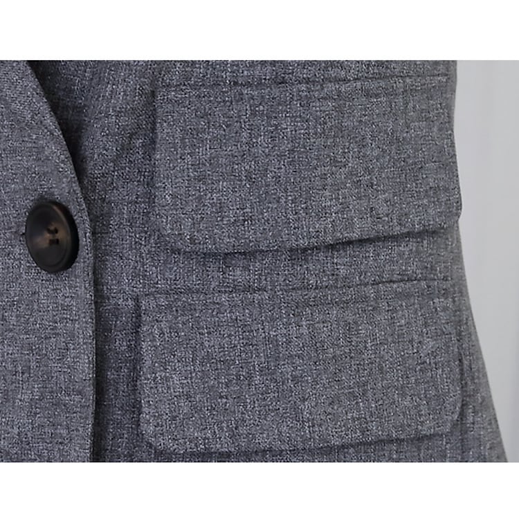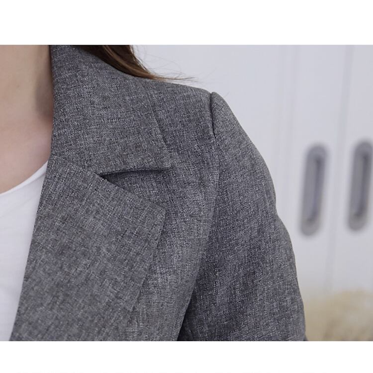 ジャケットはVネック×角襟のデザインで顔まわりをすっきり見せ、前開き仕様にボタンとポケットを配した実用的かつスタイリッシュな仕上がり。
