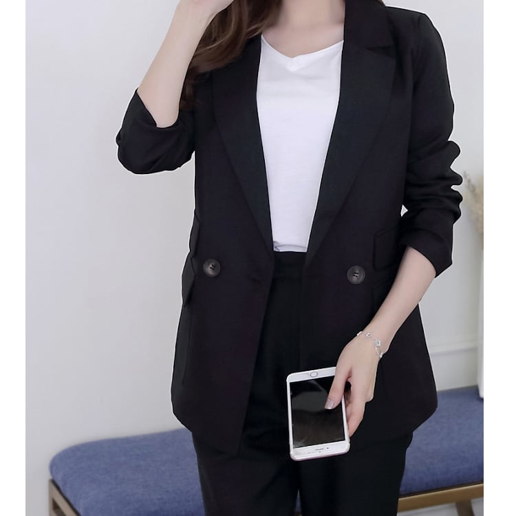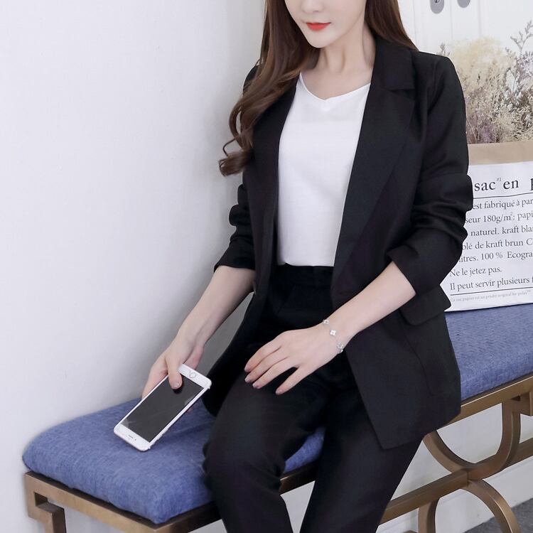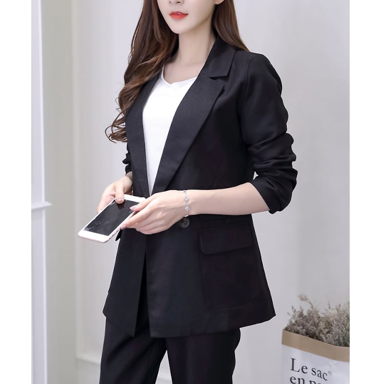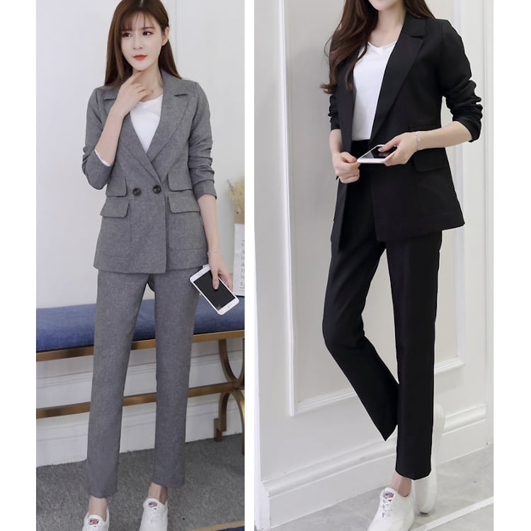 洗練されたシルエットで大人の女性を美しく引き立てる、レディース用ジャケット&パンツのスーツセットアップ。