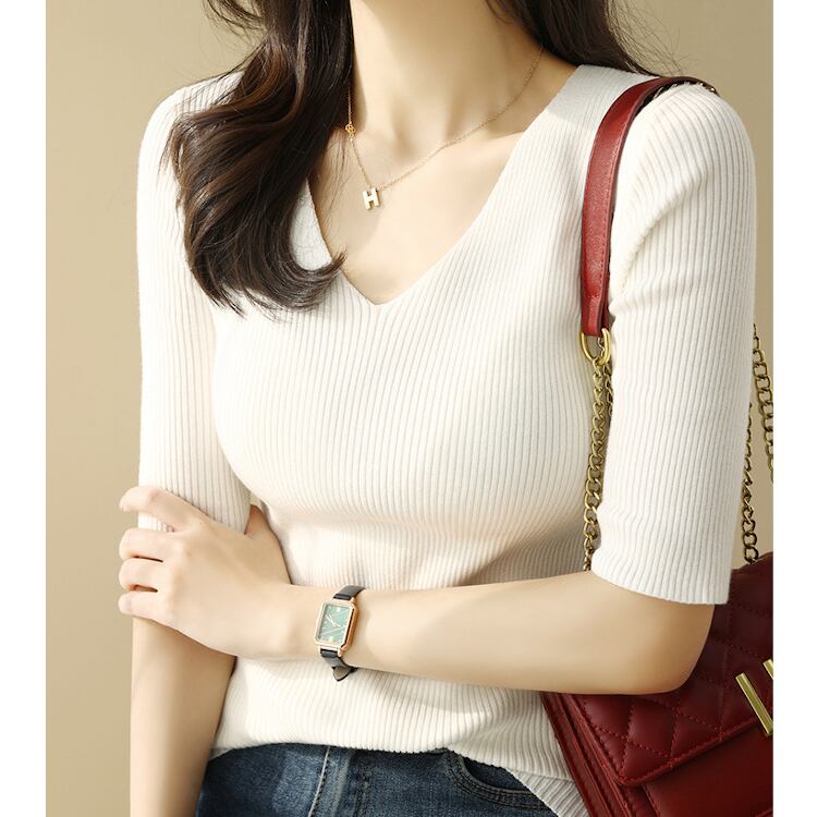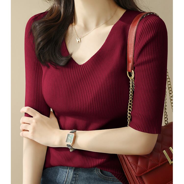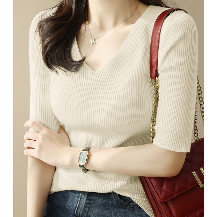 レディース トップス ニット 5分袖 Vネック 襟なし ノーカラー スリム 細身 フェミニン ストリート リブニット コンサバ フィット かわいい 大人可愛い きれいめ シンプル カジュアル 上品 おしゃれ こなれ感 存在感 清潔感 爽やか 無地 春 秋 OL 学生 デート お出かけ 旅行 公園 女子会 休日 ショッピング カフェ ランチ コーデ 普段使い 着回し モテ 清楚 S M L XL 2XL 3XL 大きいサイズ 白 ホワイト 黒 ブラック ベージュ ワインレッド ベーシックカラー 大人カラー