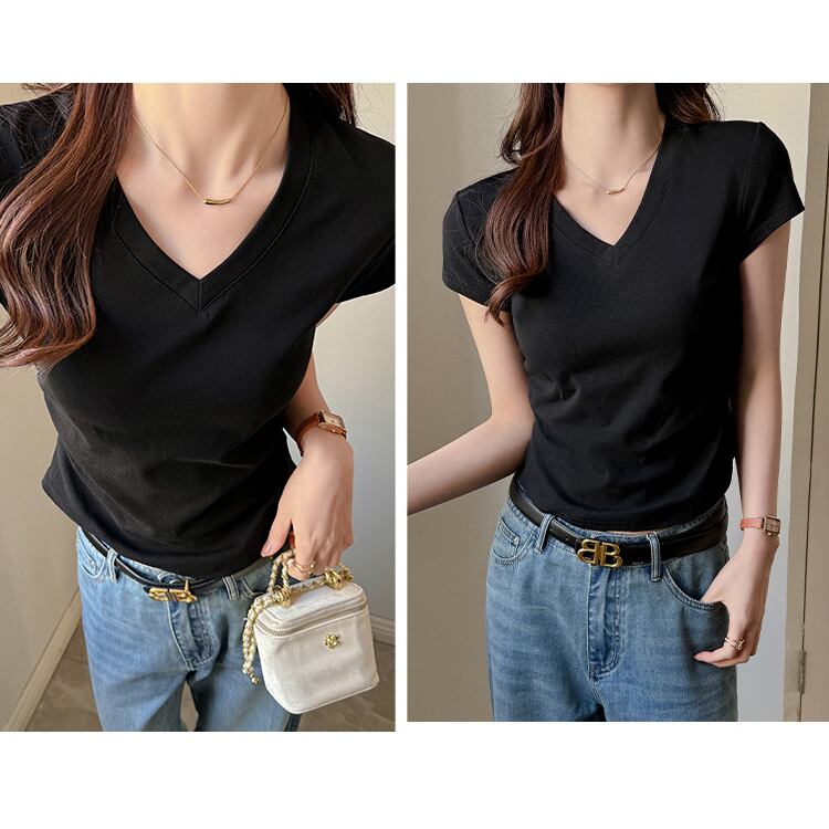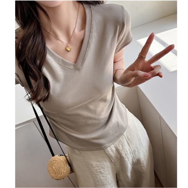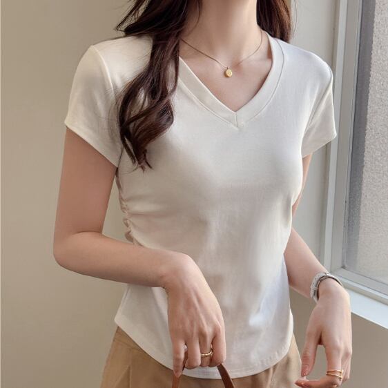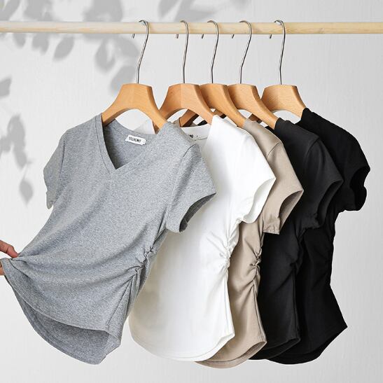 レディース トップス Tシャツ 半袖 Vネック 襟なし ノーカラー スリム 細身 フェミニン ストリート ギャザー かわいい 大人可愛い シンプル カジュアル おしゃれ かっこいい こなれ感 ラフ 存在感 ナチュラル 清潔感 涼しげ 軽やか 爽やか 無地 夏 OL 学生 デート お出かけ 旅行 ジム 公園 女子会 休日 ショッピング カフェ ランチ コーデ 楽ちん 普段使い 着回し モテ 清楚 定番 スタイルアップ S M L XL 白 ホワイト 黒 ブラック ライトグレー ダークグレー ミルクティー