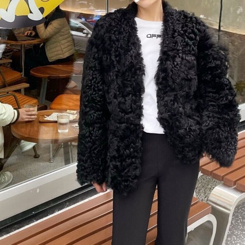 ふわふわのカールしたファーがキュートな印象を与え、シンプルなブラックカラーで上品にまとめられています。