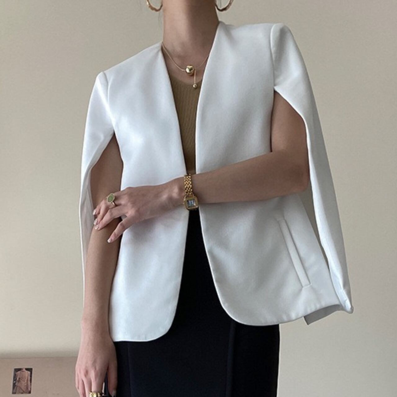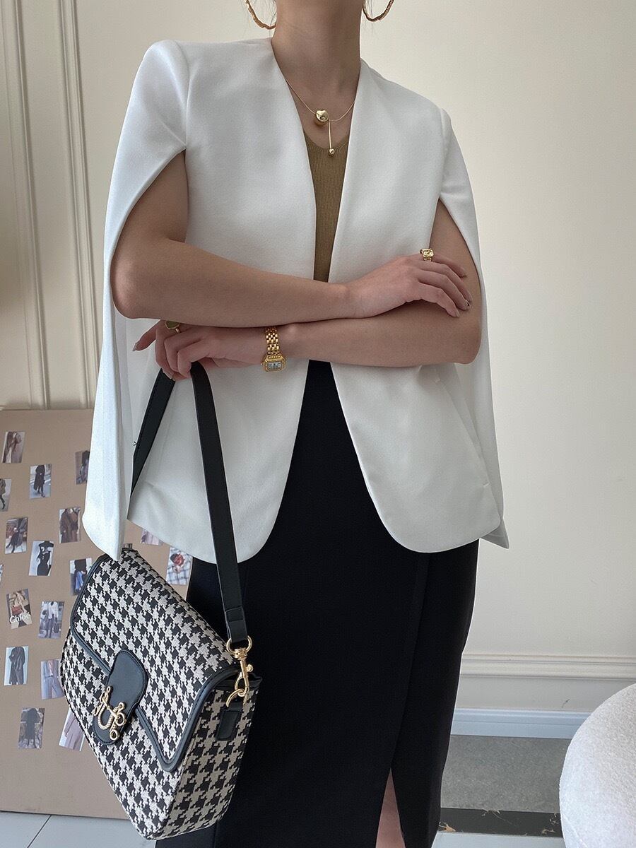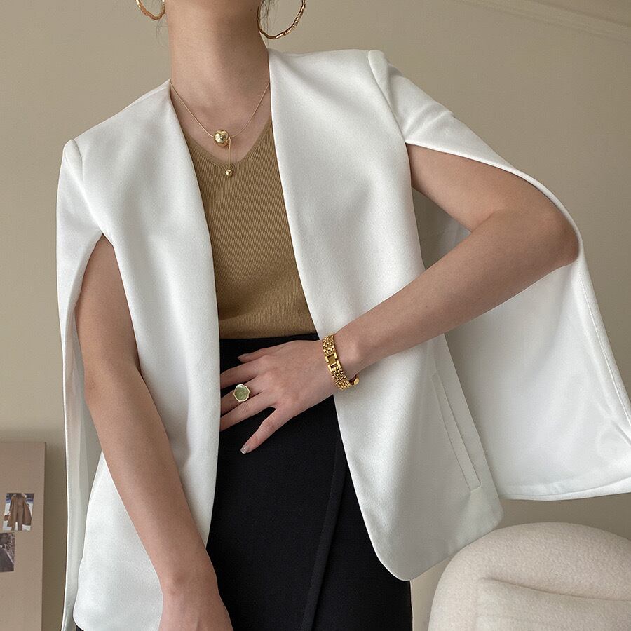 大胆なスリットから腕を出して着用するデザインが特徴のジャケット。ジャケットとしてのきちんと感を保ちつつ、ケープのような軽やかなシルエットが他にはない存在感を放ちます。襟がないノーカラーデザインなので、タートルネックやブラウスなど、様々なインナーとの組み合わせを楽しめます。パンツスタイルでクールに、タイトスカートで女性らしく、シーンに合わせて自在にコーディネート楽しんで下さい。