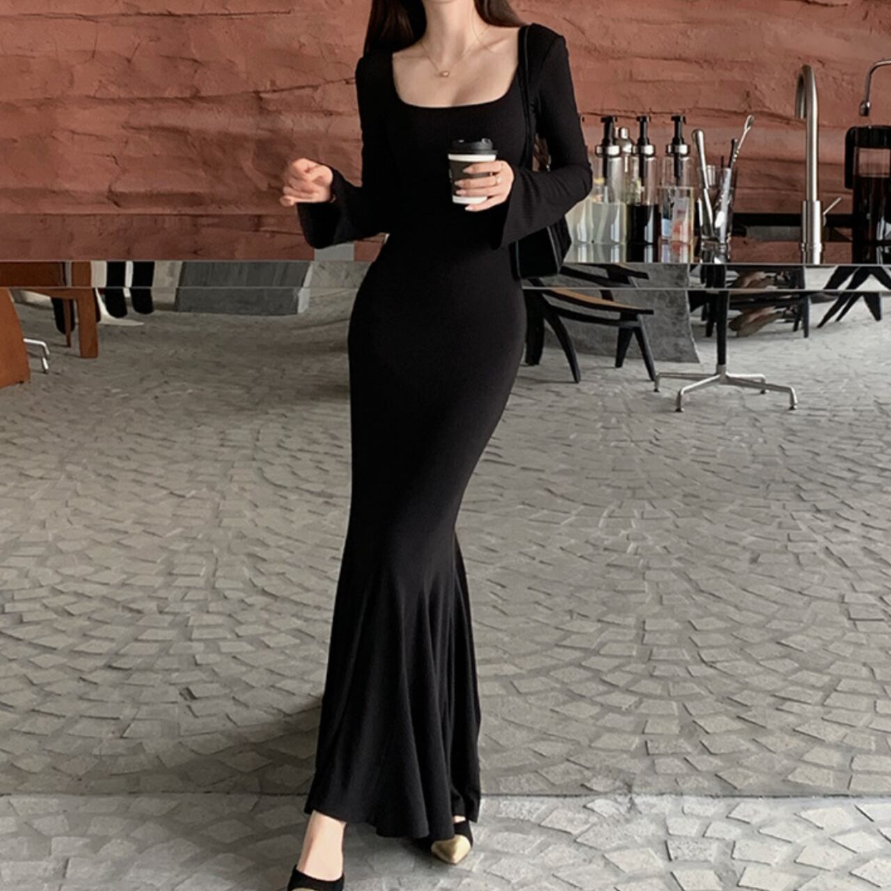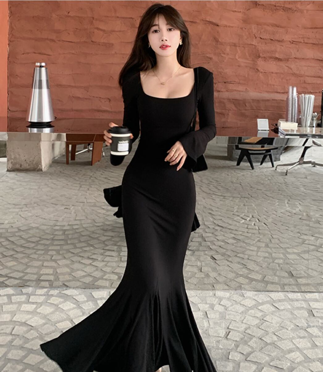 レディース ワンピース ロング マキシ 丈長 長袖 フレアスリーブ スクエアネック マーメイド 裾ワイド フィッシュテール 大人可愛い 上品 おしゃれ かっこいい こなれ感 個性的 クール モード系 エレガント 主役級 存在感 都会的 セクシー 無地 秋 冬 ロングシーズン クリスマス バレンタイン OL 学生 デート お出かけ イベント リゾート ショッピング 重ね着 韓国 オルチャン 美脚 着回し モテ トレンド 流行 インスタ映え スタイルアップ S M L 黒 ブラック モノトーン ベーシックカラ