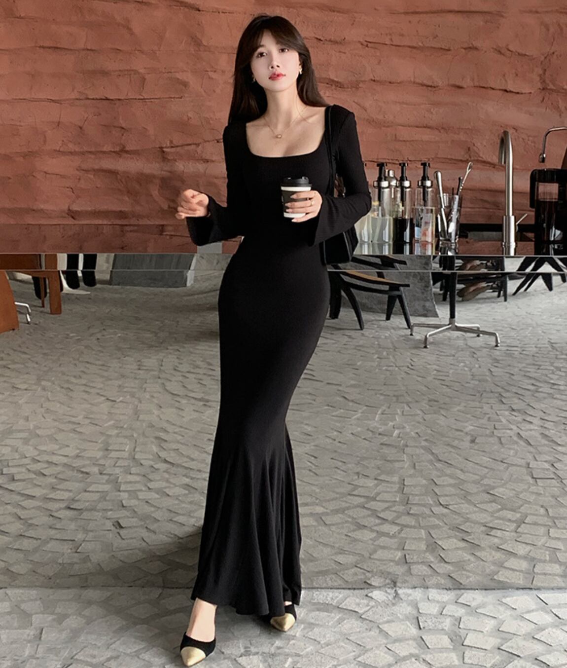 着るだけで優雅な気分になれる、マーメイドロングワンピース。ボディラインに沿うようにデザインされた美しいシルエットが、女性らしい曲線美を引き立てます。膝下から広がるフレアな裾が、歩くたびに揺れて、エレガントな雰囲気を演出。シンプルなデザインながらも、印象的なスタイルを叶えます。首元を美しく見せるスクエアネックと、手首にかけて広がるフレアスリーブが、洗練された大人の女性らしさを引き立てます。パンプスやヒールと合わせれば、パーティーや特別なディナーにもぴったりなドレッシースタイルに。ジャケットやカーディガンを羽織れば、デイリーユースにも活躍する、着回し力抜群のアイテムです。