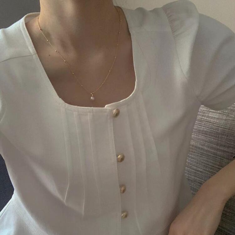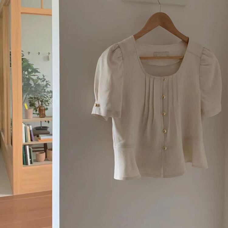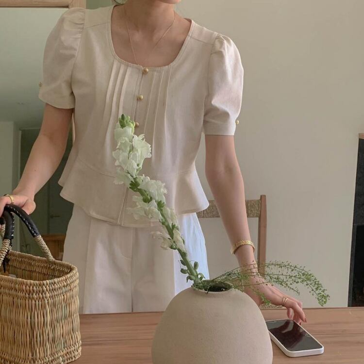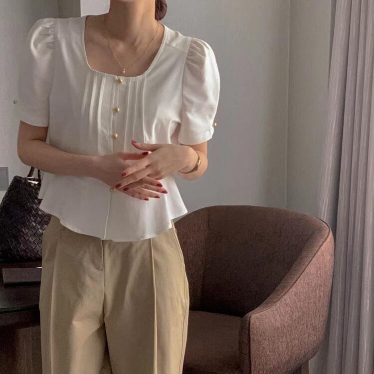 ふんわりとしたパフスリーブと、デコルテをきれいに魅せるスクエアネックが印象的なブラウス。