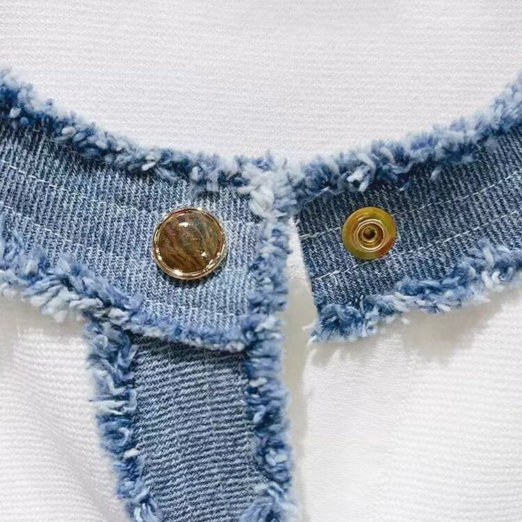 胸元のボタンディテールがアクセントになり、カジュアルな雰囲気の中にも女性らしさをプラス。