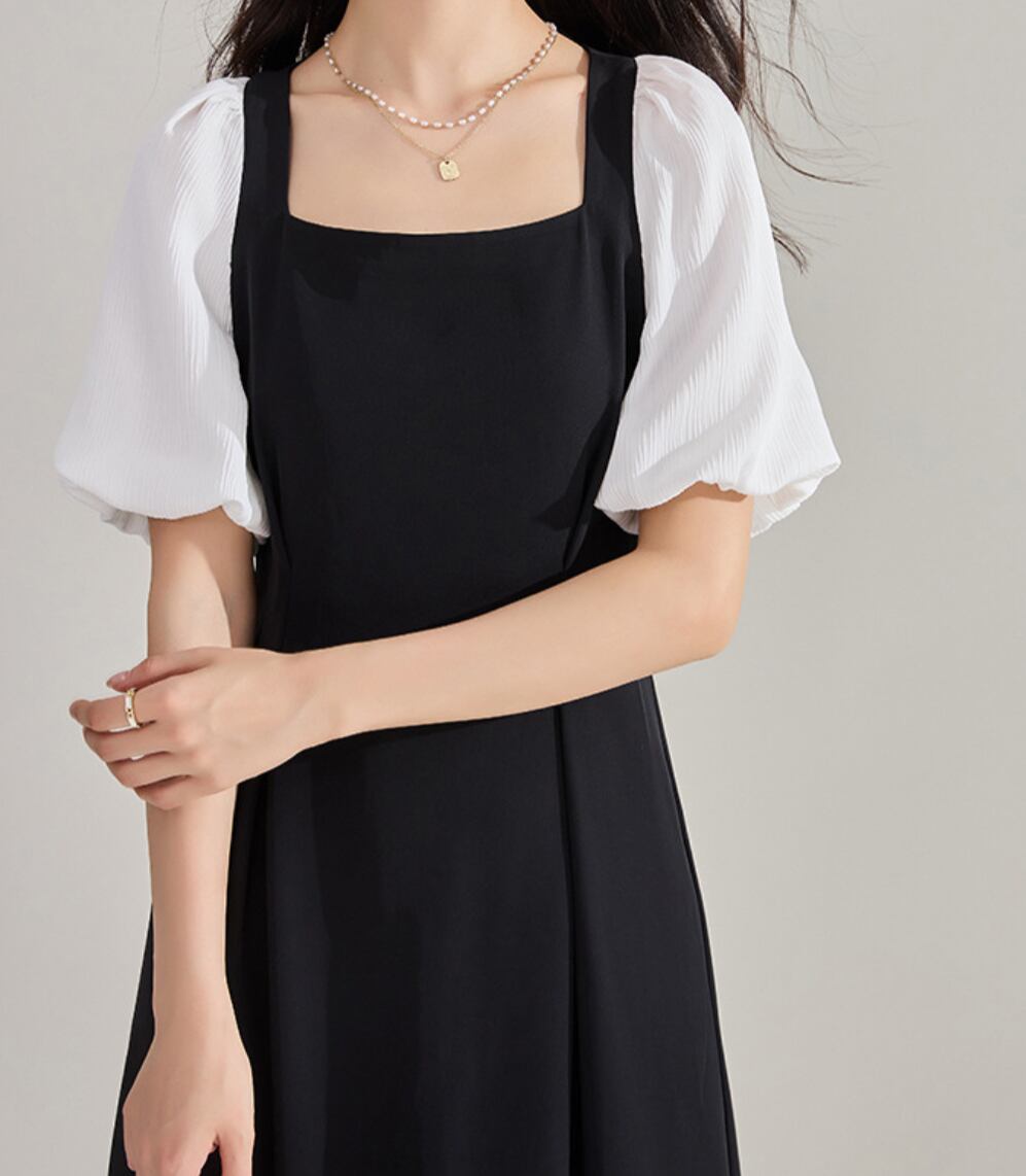 ワンピース レディース 膝丈 半袖 5分袖 パフスリーブ スクエアネック フレア Aライン タック バイカラー 配色 異素材ミックス モノトーン 大人可愛い シンプル カジュアル 上品 おしゃれ こなれ感 ラフ ガーリー ルーズ 個性的 モード系 存在感 とろみ感 抜け感 ラブリー ナチュラル 清潔感 軽やか 春 夏 オフィス OL 通勤 デート お出かけ イベント 女子会 休日 ショッピング カフェ フェス ランチ 韓国 オルチャン 脚長 普段使い 清楚 トレンド スタイルアップ S M L ブラック
