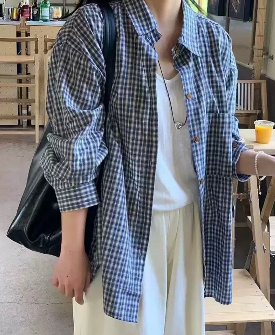 トップス シャツ レディース 長袖 襟付き 前開き 薄手 シンプル カジュアル 上品 おしゃれ かっこいい こなれ感 ラフ メンズライク ボーイッシュ スポーティー ルーズ 個性的 クール 存在感 抜け感 ナチュラル リラックス 軽やか チェック柄 春 秋 冬 オフィス OL 通勤 デート お出かけ イベント 女子会 休日 ショッピング カフェ ランチ 韓国 オルチャン コーデ 楽ちん 体型カバー 普段使い 着回し レイヤード トレンド S M L XL 2XL 3XL ゆったり オーバーサイズ ブルー